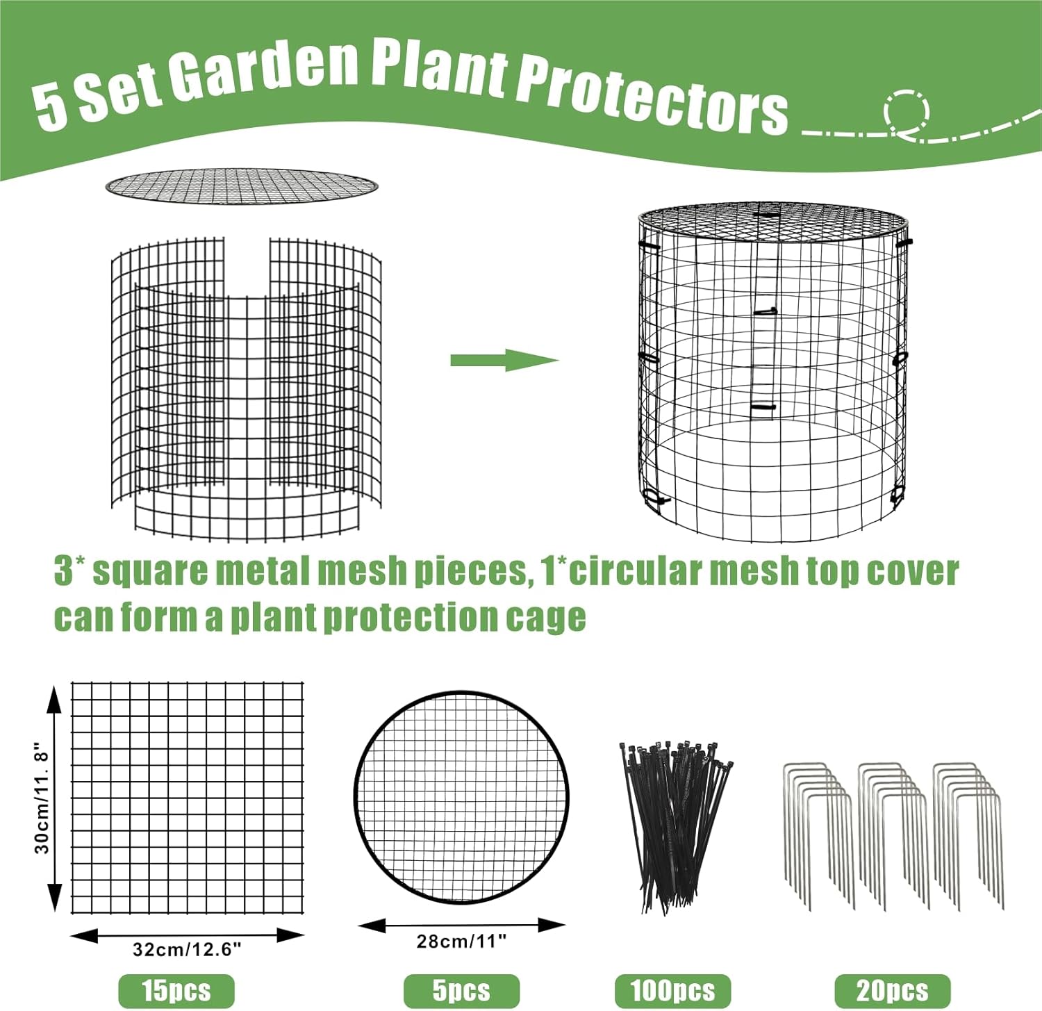 • You Will Get: You will receive 5 sets of wire plant protectors, each wire mesh size is 11.8 inches high x 12.6 inches wide, including 15 pack metal mesh pieces, 5 pack round mesh top covers, which size is 11 inches, 20 x fixing stakes, and 100 x ties, you can combine 6 or more grids to get larger plants, which will provide enough space for plant growth space