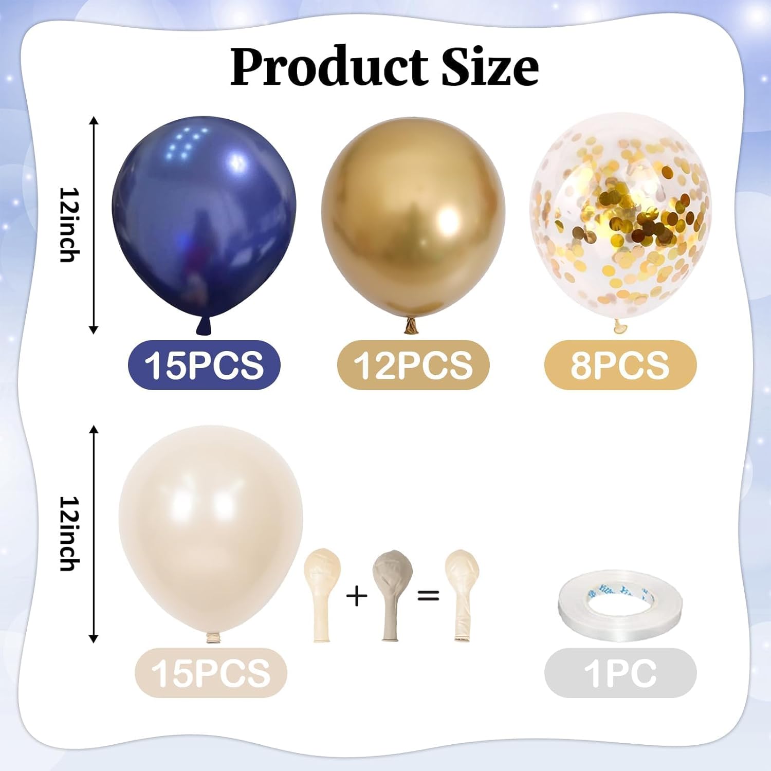 • Double Stuffed Pearl Navy Blue Balloons Set: This 12 inch balloons package includes 15pcs pearl navy blue balloons, 15pcs double stuffed pearl white sand balloons, 12pcs metallic gold balloons, 8pcs Gold Confetti balloons. Arrives ready to use with ribbon—just inflate and decorate. Brighten up your party space with our balloons!