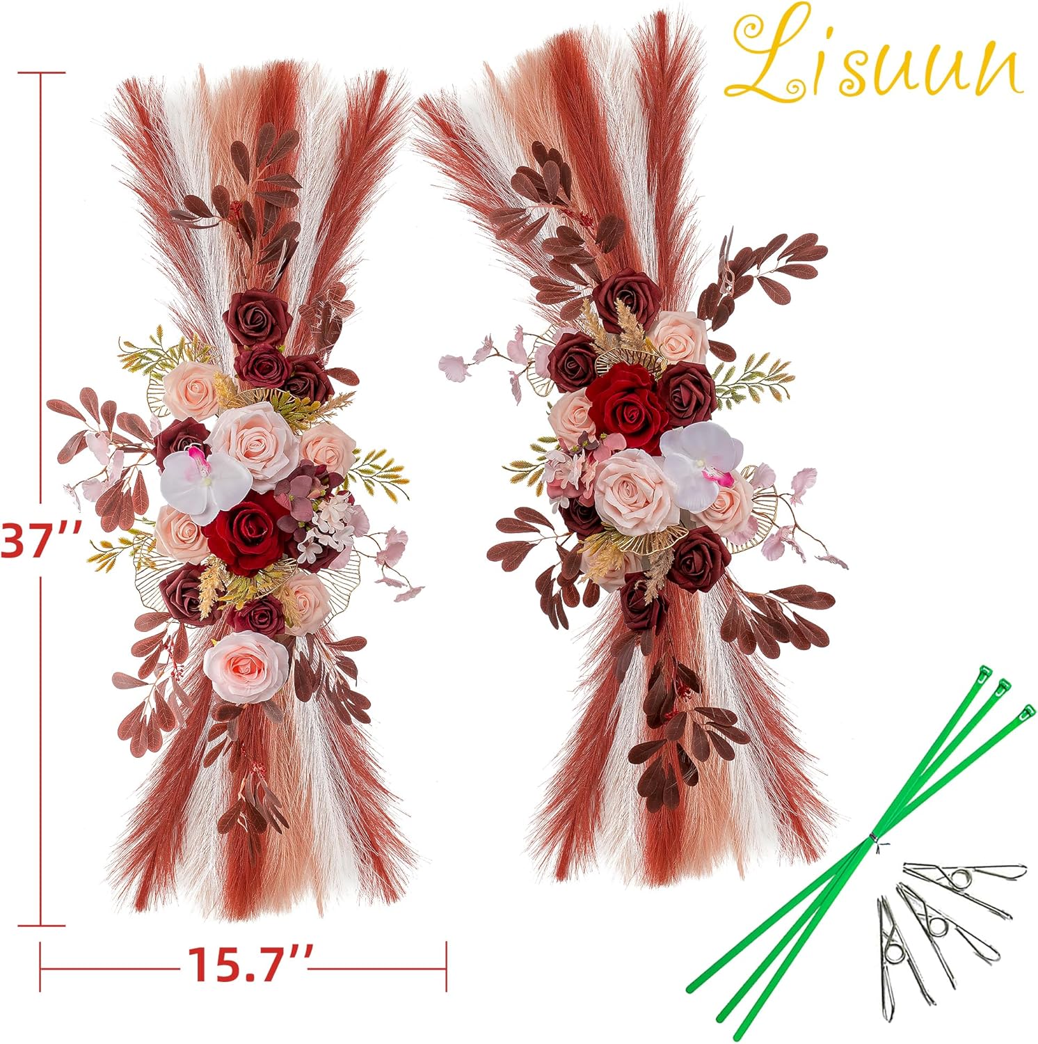 • Enlarged Size:The large flower swag design straightens measures 40" long x 14" wide(100*35cm), small flower tie measures 24" long x 12" wide(60*30cm),the larger size contains more flowers and decorations, let your wedding ceremony more colorful atmosphere.