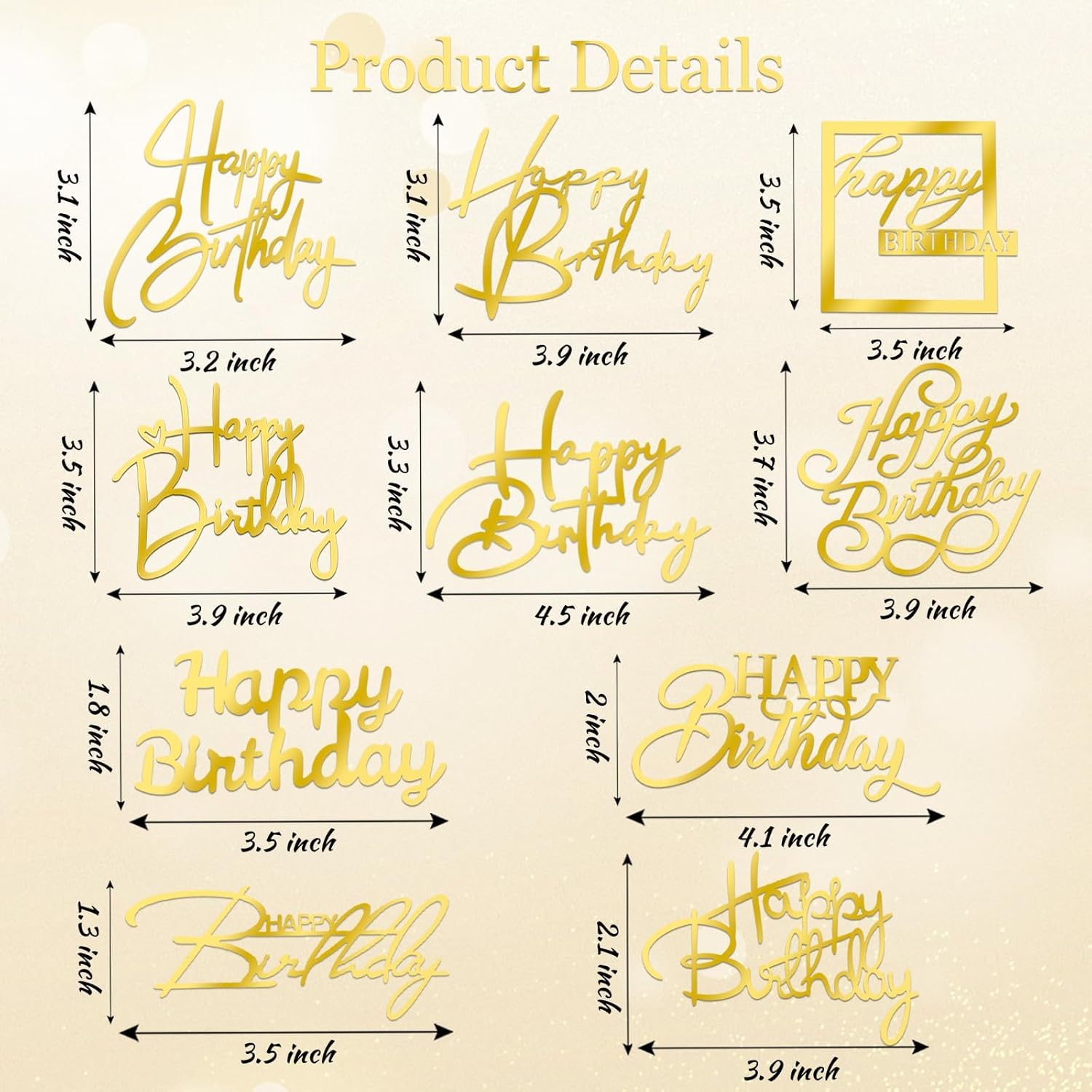10 PCS Gold Happy Birthday Cake Topper Mirror Acrylic Cake Toppers Double-Sided Glitter Birthday Decorations for Girls Women's Party Supplies