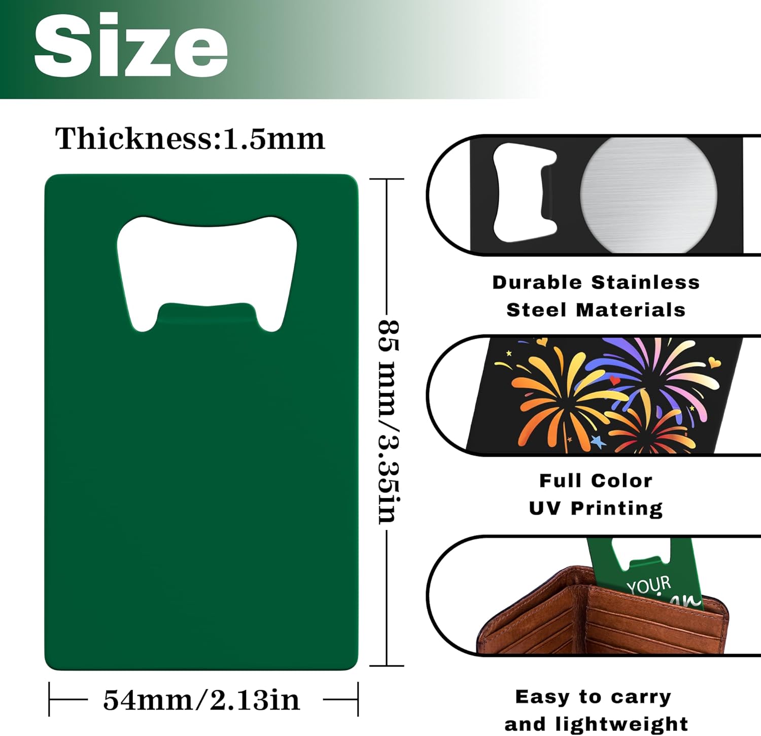 • Premium Material: Made from premium stainless steel for wear resistance and colorfastness, easy to fit in pocket. Credit card bottle openers allows you to open bottles with ease. Product dimensions are 3.35 x 2.13 inches / 8.5 x 5.4 cm.