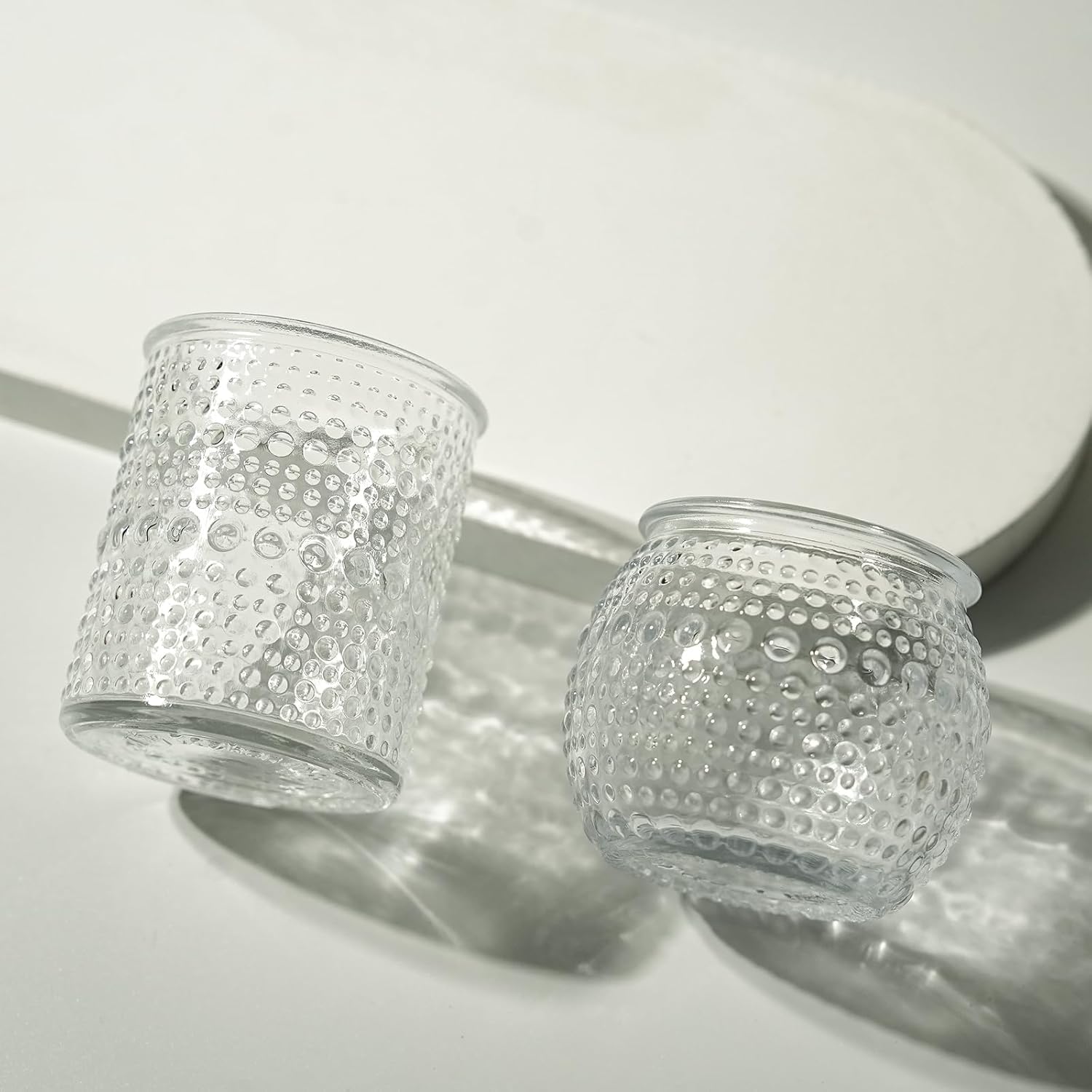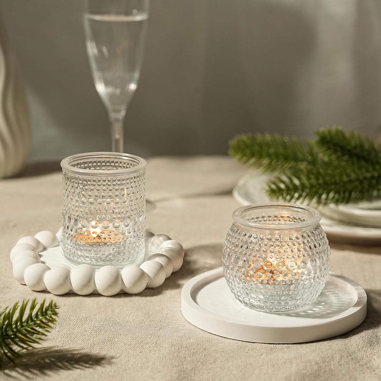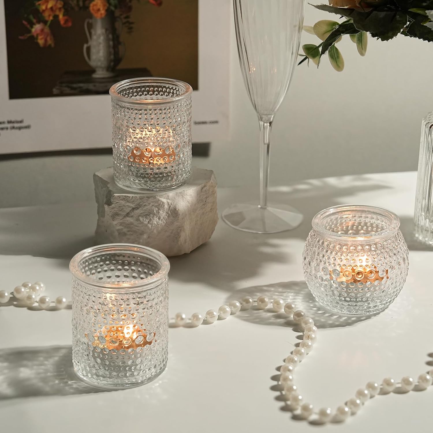 • Dazzling Dot Tea Lights Candle Holder: Each tea lights candle holder features delicate dot embellishments that catch and refract light, casting mesmerizing patterns when lit. The transparent glass enhances this effect, turning ordinary candles into a stunning light display