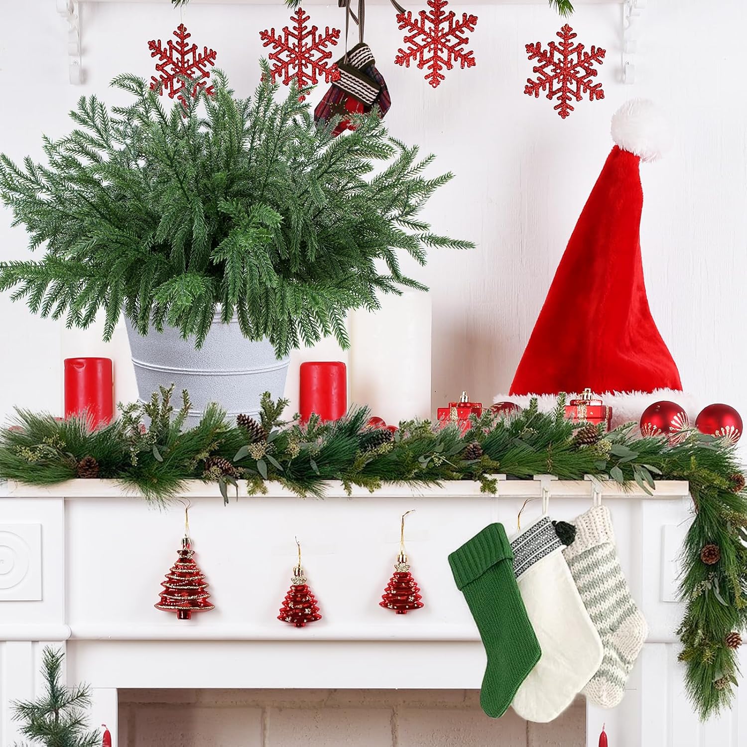• 24Pcs Artificial Pine Branches: This set includes 24pcs real touch Norfolk pine branches, giving you plenty for decorating. As shown, 24 branches can fill a vase for a full and lush look, and they’re also ideal for making Christmas wreaths or garlands