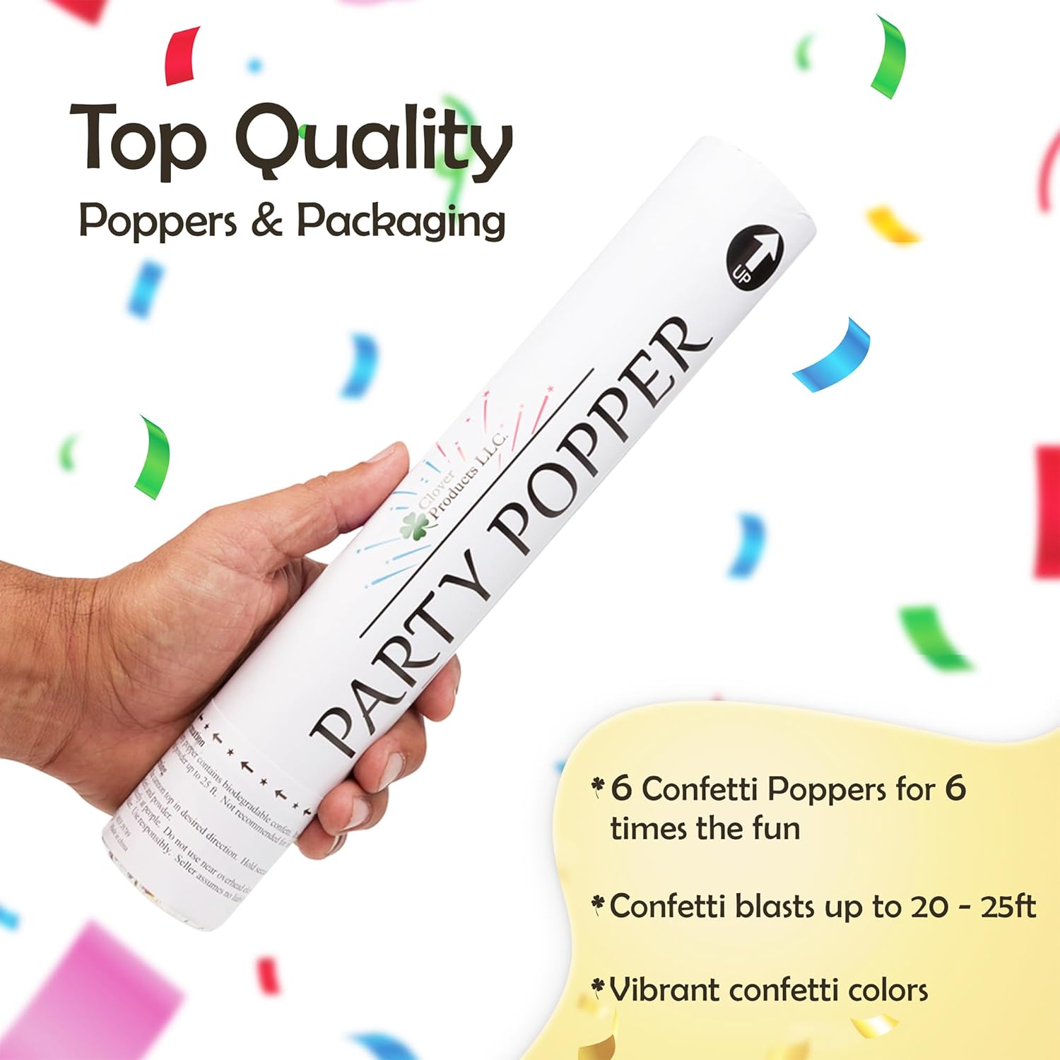 Clover Products 12" Biodegradable Confetti Cannons | 6 Pack Confetti Poppers for Weddings, Birthdays & Parties | Air-Powered Party Poppers Shoot 25 Feet | Safe for Indoor & Outdoor Use