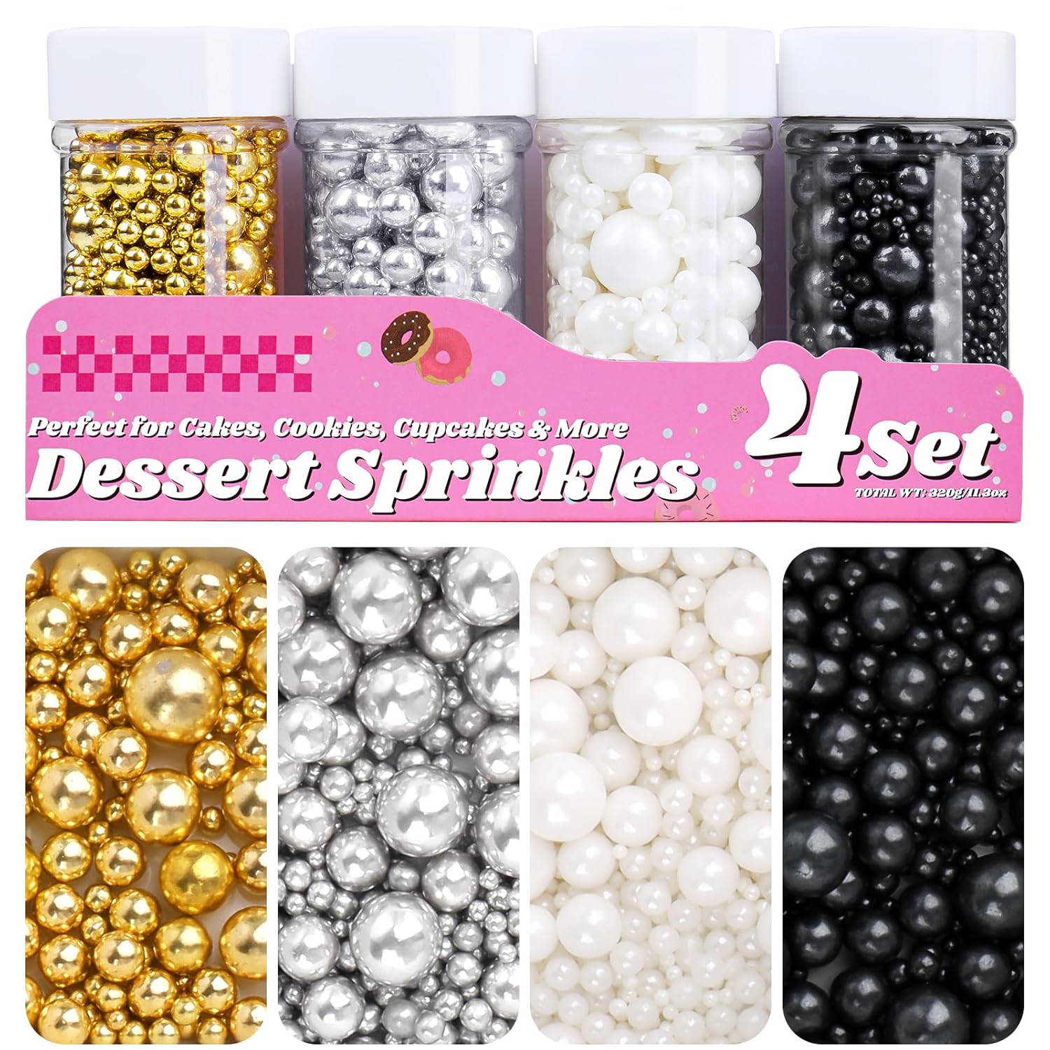 • 【Four Colors in One Set】Includes 4 jars different colors of edible pearl sprinkles (white, gold, silver, black), perfect for all baking needs, bake like a pro with just one set