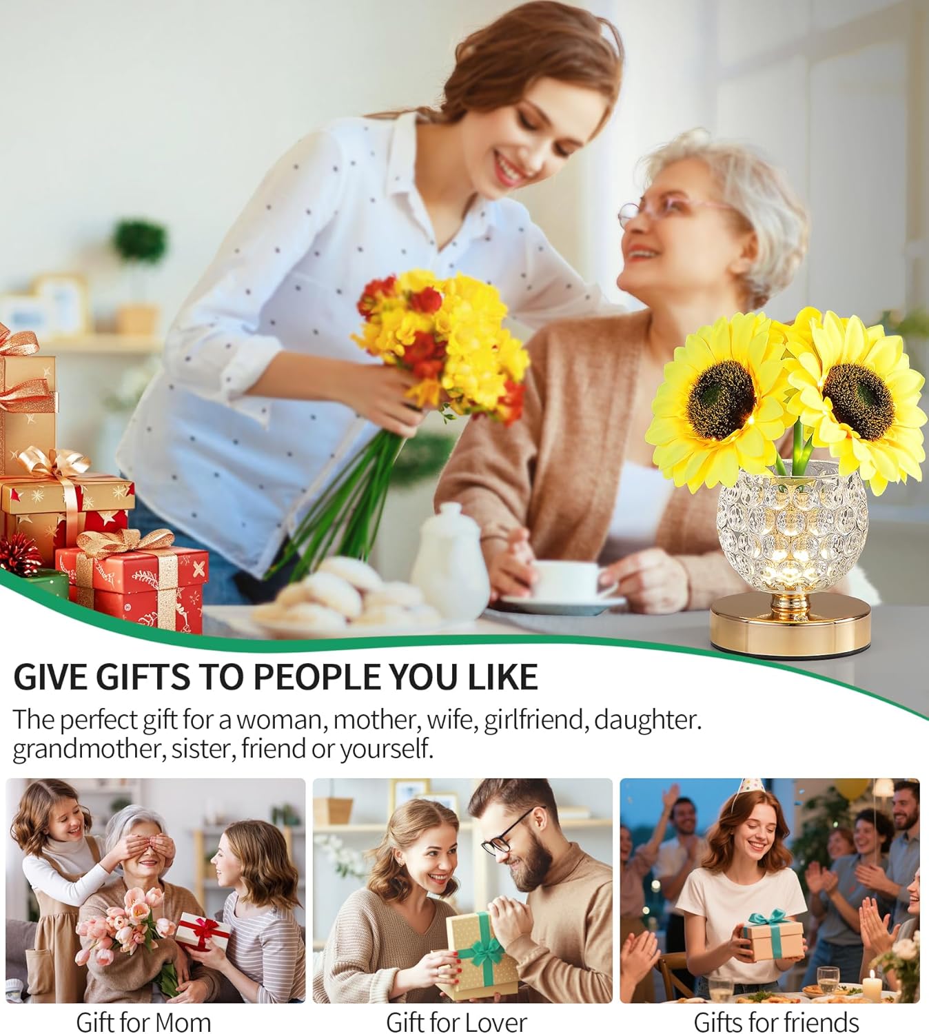 • 🎁 Unique Gifts & Romantic Gift:This charming sunflower flower dimmable night light blooms with golden sunflower petals and emits a charming light.When sunflower lamp combined with a crystal lampshade,the rechargeable night light will be an ideal gift for women,mom,friends,lovers or family on birthdays,Mother's Day,Wedding,Valentine's Day or Thanksgiving,Christmas.