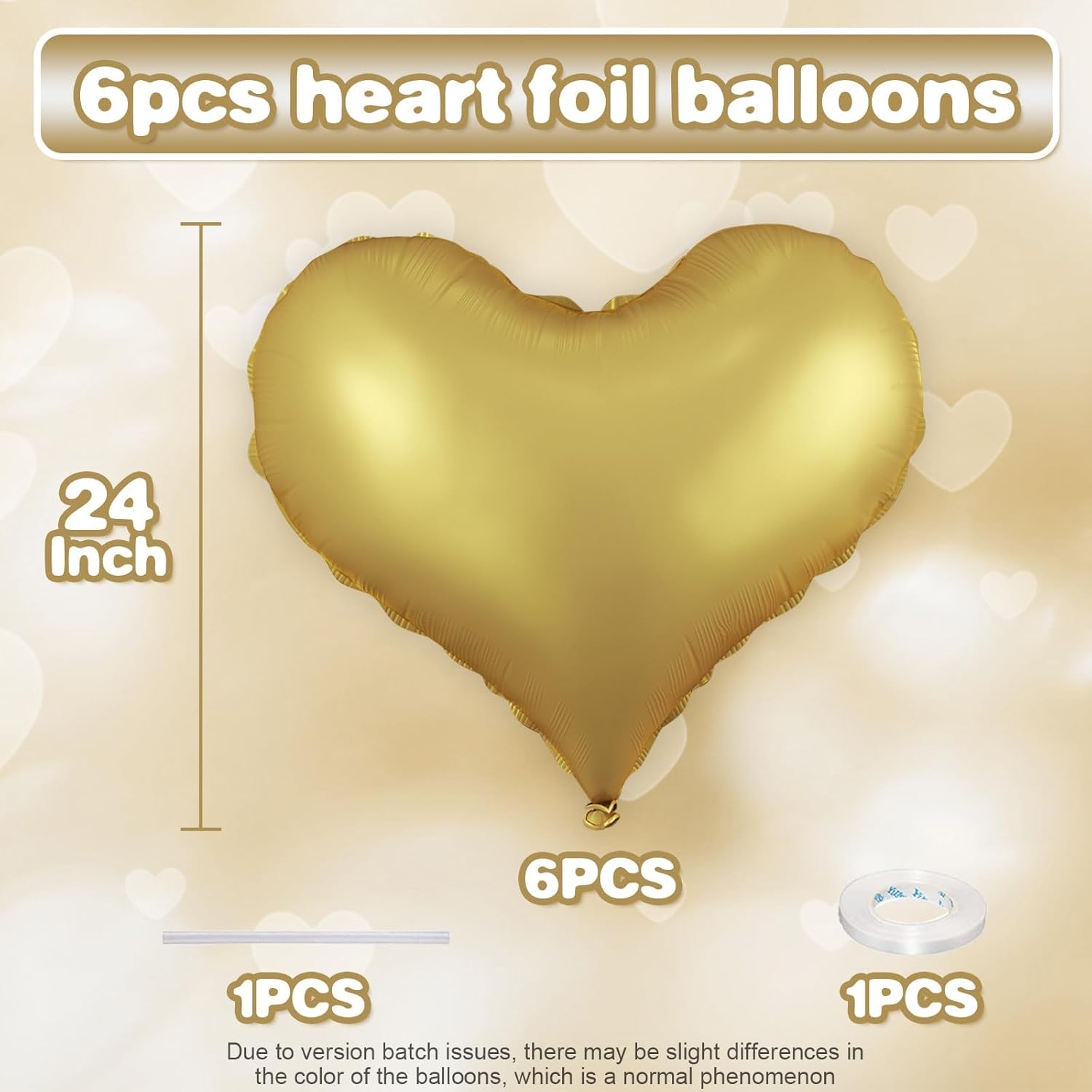 • Package: This set includes 6pcs of 24inch gold heart foil balloons,1 ribbon,and 1 straw.The generous size makes these balloons perfect for transforming any space into a festive celebration venue, whether you're decorating for a wedding arch, photo backdrop, or party centerpiece.