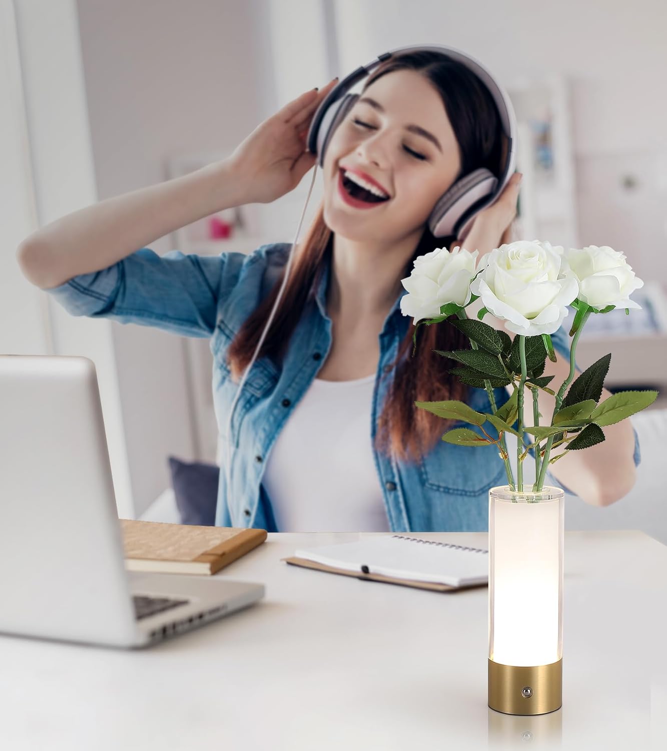 • Elegant Vase+Dimmable Night Light dual function Design:This white rose vase lamp is both an elegant decorative vase and a dimmable cordless touch night light.The vase is equipped with a built-in water-fillable glass tube,which can be replaced with fresh flowers or plants at any time.When the flower night light is inserted with roses (included) and paired with the soft light of the vase,rechargeable cordless touch table lamp will be a unique gift!This is a gift for women,a birthday gift for teenage girls or daughters.A sweet romantic gifts for Mom.The portable ambient night light is also very suitable for dining rooms to enhance the space and add a romantic sweet atmosphere.
