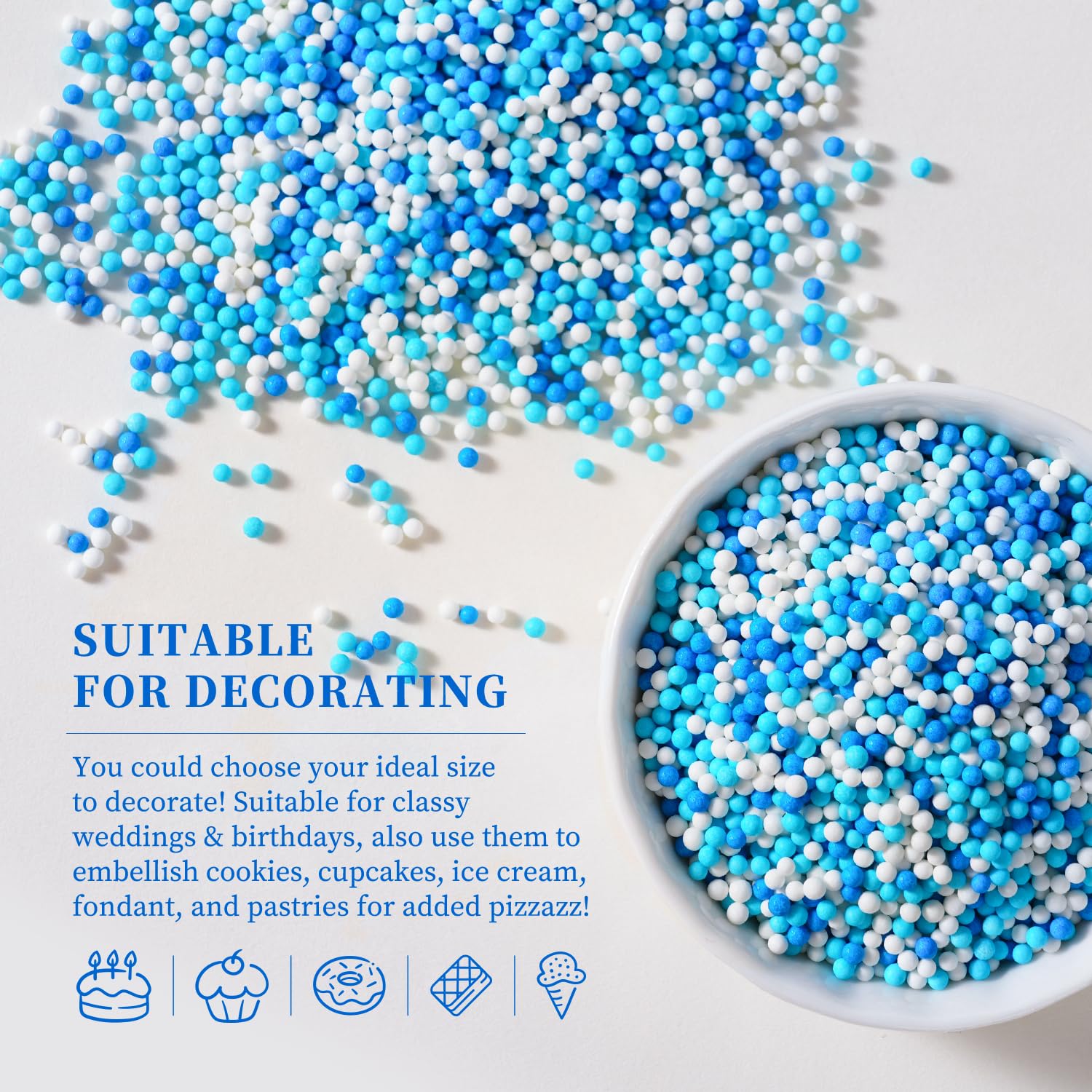 • High Quality and Safe: Made with food-grade ingredients. Edible, Nut-free, Dairy-free, Non-GMO. Our blue and white pearl sprinkles(2mm) meet American food standards and guard your and your family's health