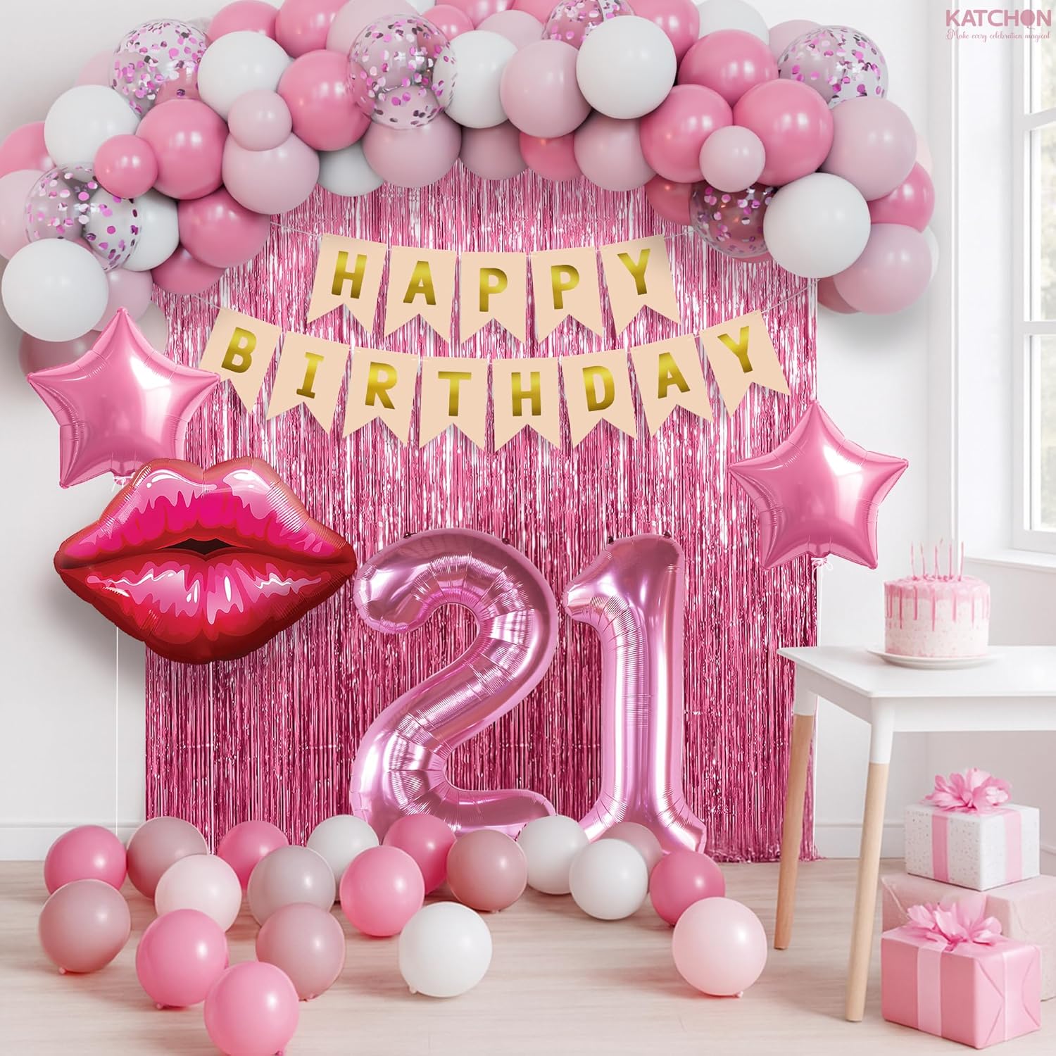 KatchOn, Pink 21st Birthday Decorations Set with Lip & Star Balloons – Pack of 42 | Happy Birthday Banner & Lip Decor | 21st Happy Birthday Decorations for Women, Girls & Her | Pink Party Decorations