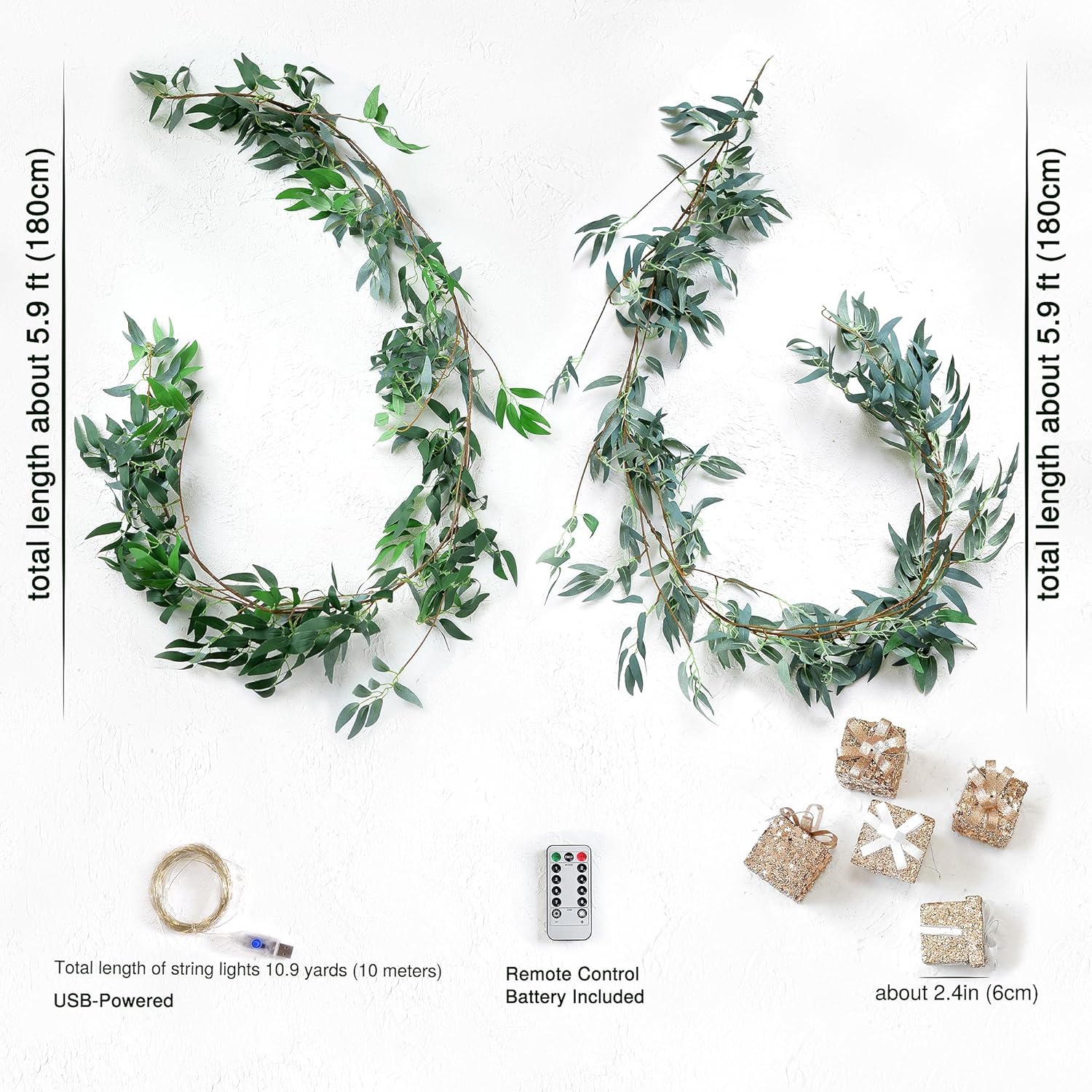 • 2-Pack Willow Leaf Garlands with Lights – Each 5.9 ft garland features lush silk greenery on a flexible wire core, easy to bend, drape, or wrap around mantels, arches, stair rails, and tables.