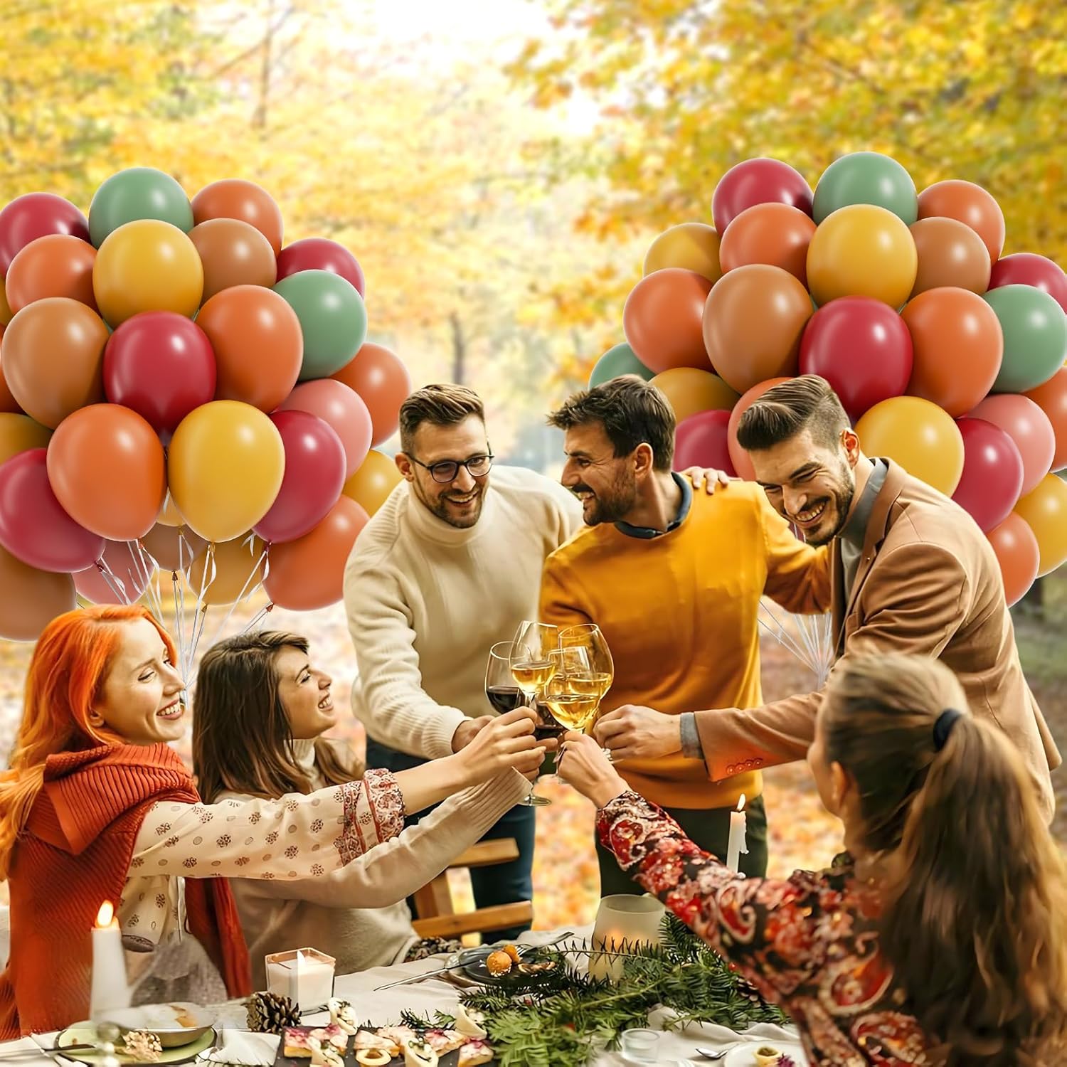 • Package Include: The fall balloons include 12inch burgundy balloonsx15, 12inch brown balloonsx10, 12inch sage green balloonsx5, 12inch burnt orange balloonsx15, 12inch mustard yellow balloonsx10, 12inch dusty pink balloonsx5, glue dotsx20, white ribbonx1
