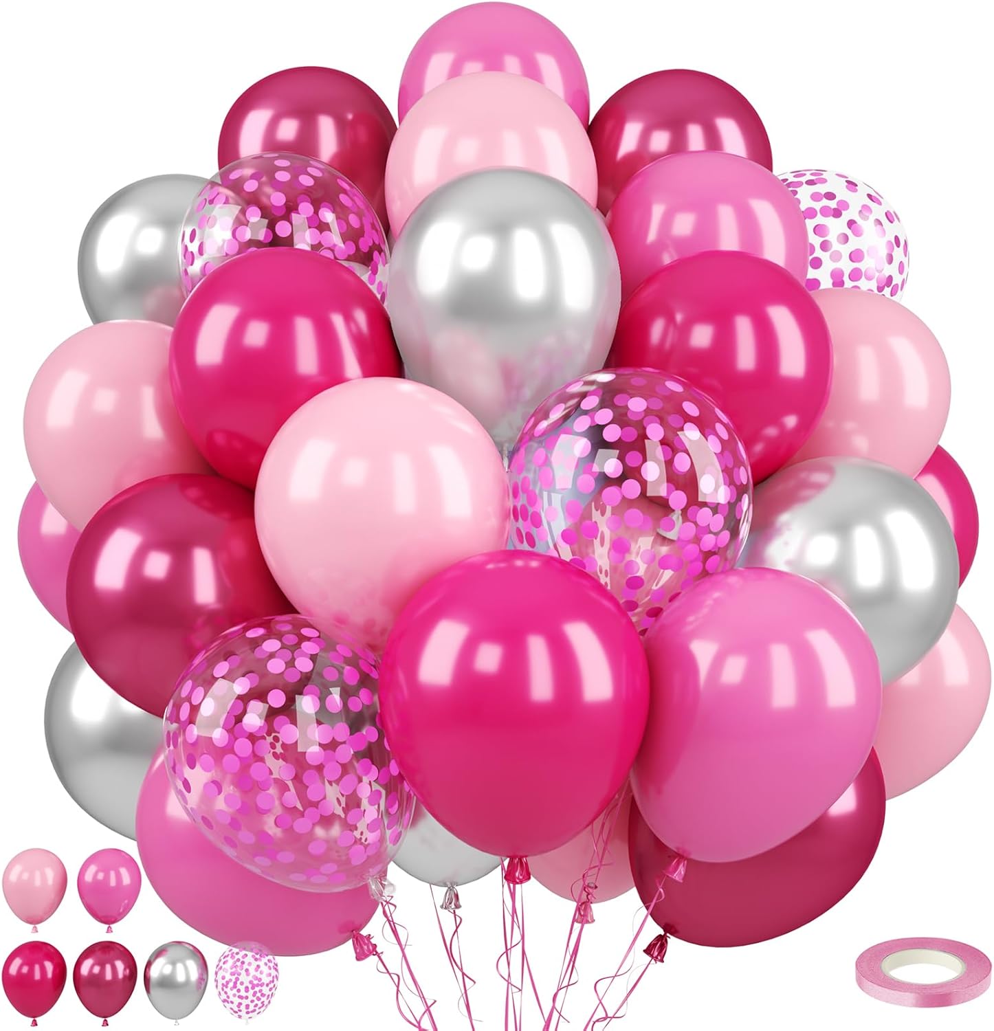 • What You Get - The pink balloons include 50 balloons, 6 distinct colors: hot pink balloons x 10, mattee pink balloons x 10, light pink balloons x 12, retro translucent rose red balloons x 6, dark pink confetti balloons x 5, Metallic silver balloons x 4. Accompanying by a 10m ribbon. These striking and captivating hues will beautifully enhance your memorable and enjoyable moments!