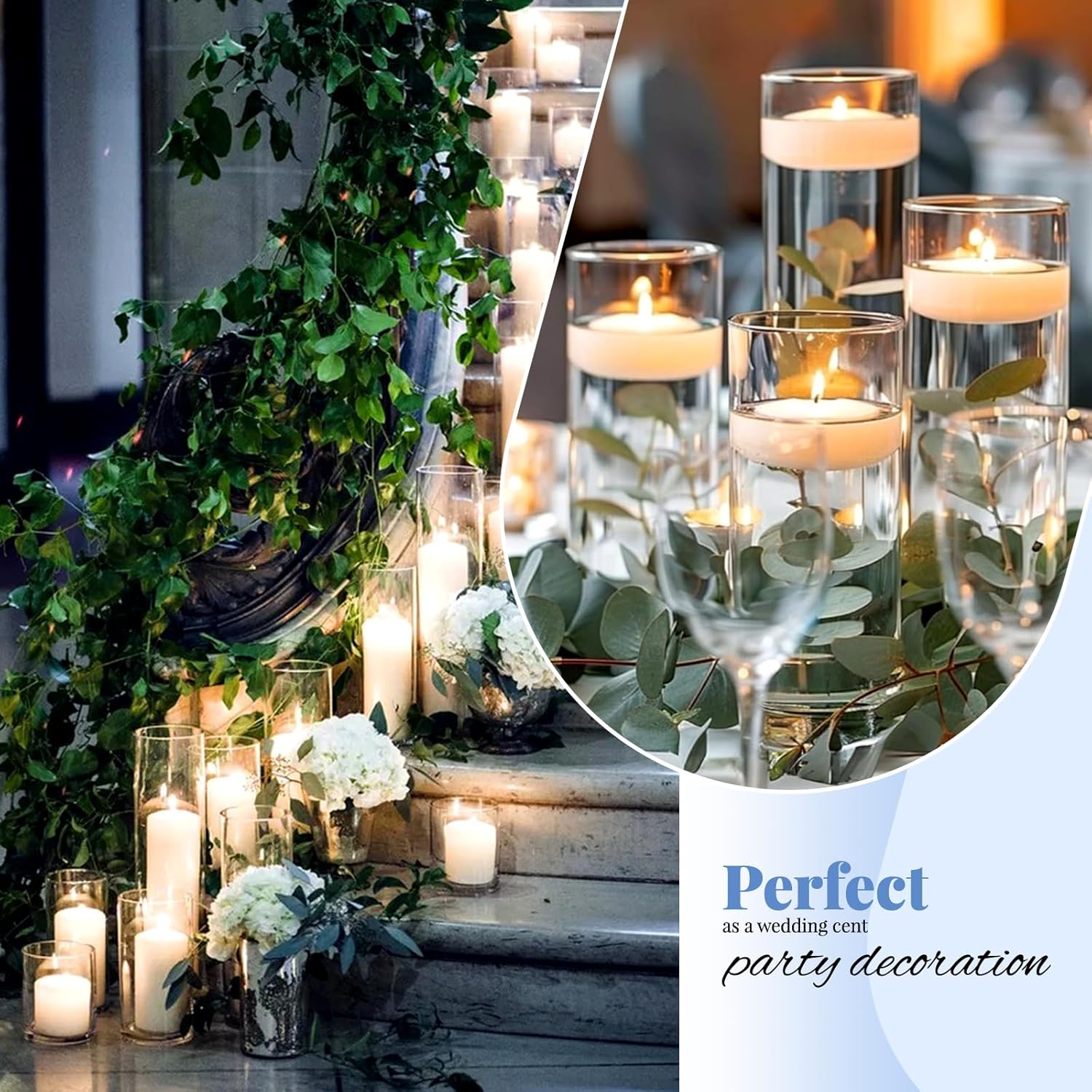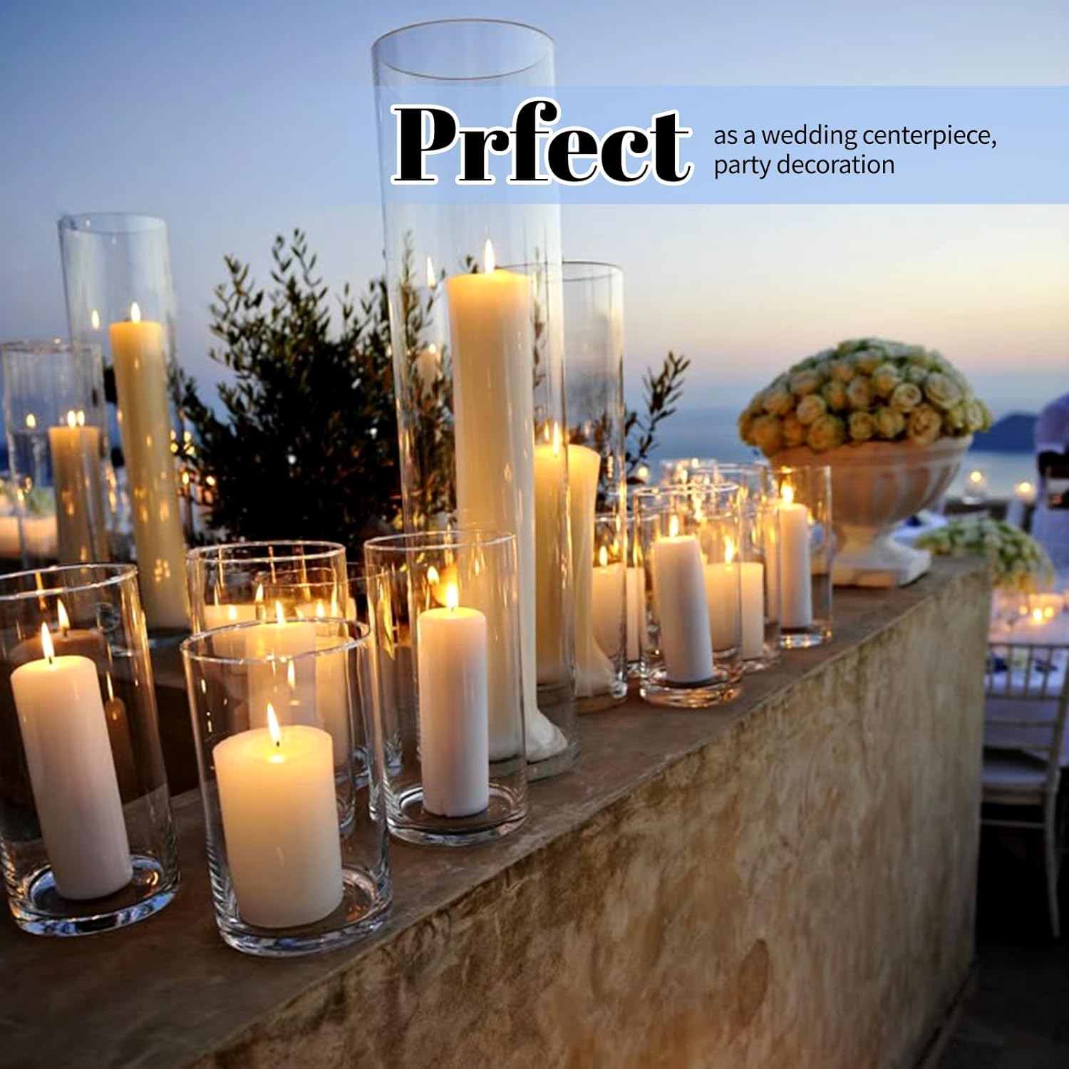 • ✅ Premium High-borosilicate Glass: Crafted from food-grade, heat-resistant borosilicate glass, our vases for centerpieces ensures exceptional clarity and durability. Designed with a solid base and smooth, polished rim, this flower vase provides stability and safety during use. This sturdy material can withstand greater temperature changes than regular glass. Perfect for use as a hurricane floating candle holder or for pillar candle holder.