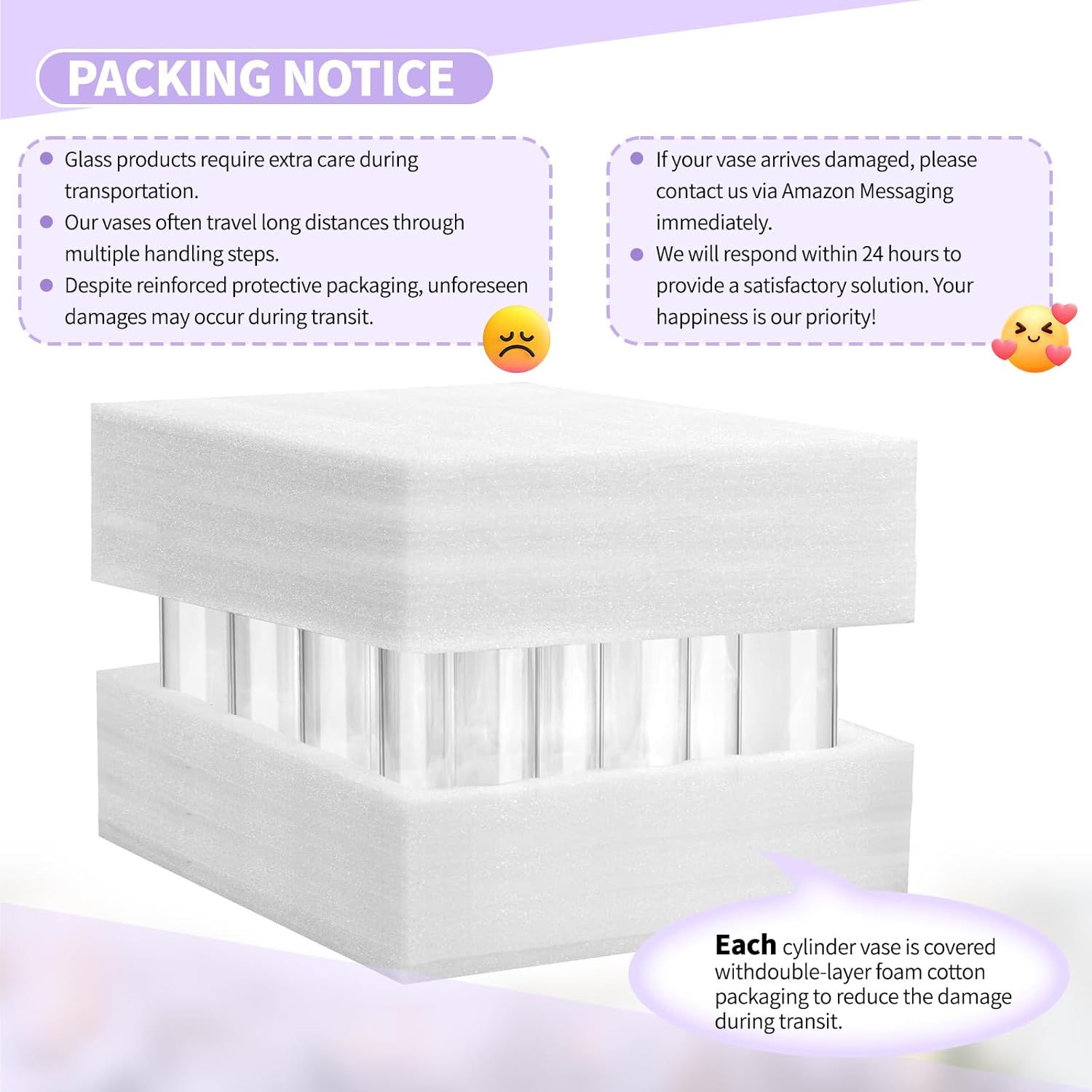 • ✅ Safe Package: Each glass cylinder vase arrives carefully protected with dual-layer foam cotton to prevent transit damage. But if anything arrives less than perfect? No worries. Just message us via Amazon—we’ll respond within 24 hours and make it right. Your happiness is our priority!