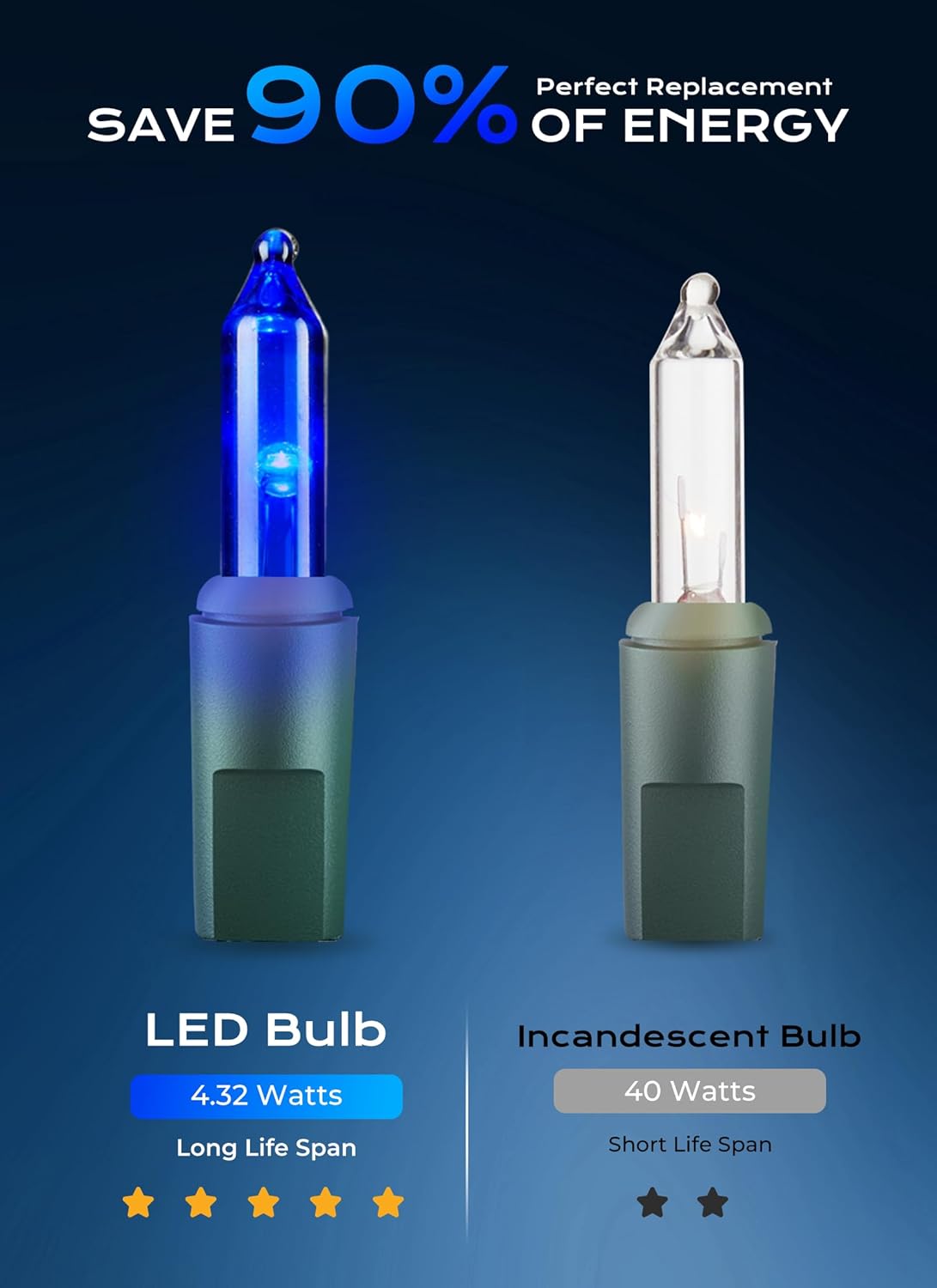 • [Mini Christmas Lights Set] Christmas lights on green wire set includes 100 count transparent LED mini-lights, 33 feet green wires, and each bulb is 4 inches apart, 24 inches lead wire, 4 inches end connector. Christmas String light sets come with 2 spare fuses and 2 spare bulbs for easy replacement. This mini Christmas light can be connected end to end and can be extended to a longer connection length, making it be suitable for different decoration needs