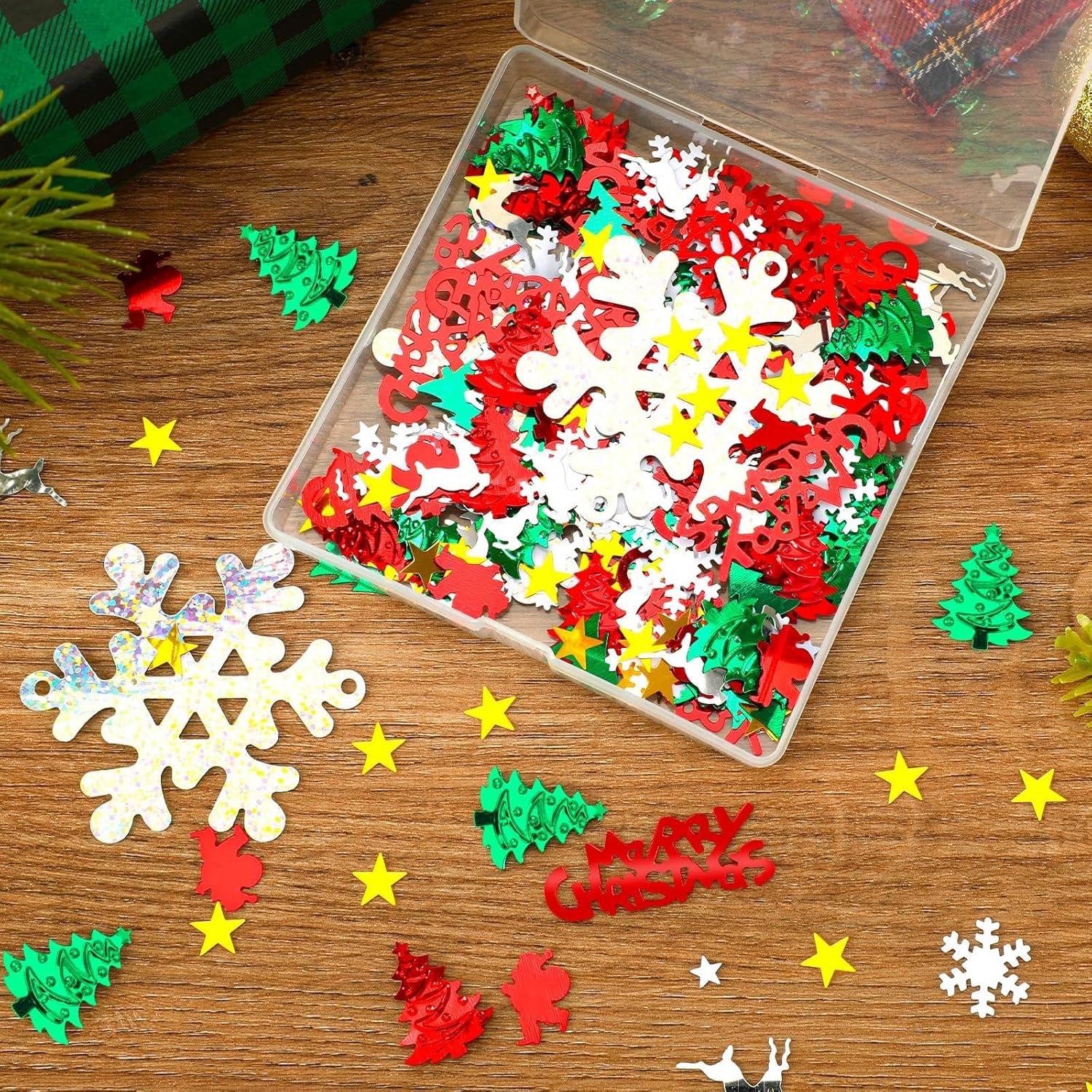 • Various Xmas Styles: The confetti are 10 styles of Christmas sprinkles confetti, including large snowflakes, Christmas trees, Santa Claus, elk, five-pointed stars, etc. All styles are based on the theme of Christmas to help you decorate various Christmas parties