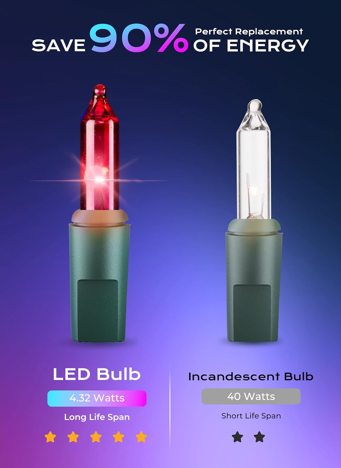 • [Mini Christmas Lights Set] Christmas lights on green wire set includes 100 count transparent LED mini-lights, 33 feet green wires, and each bulb is 4 inches apart, 24 inches lead wire, 4 inches end connector. Christmas String light sets come with 2 spare fuses and 2 spare bulbs for easy replacement. This mini Christmas light can be connected end to end and can be extended to a longer connection length, making it be suitable for different decoration needs