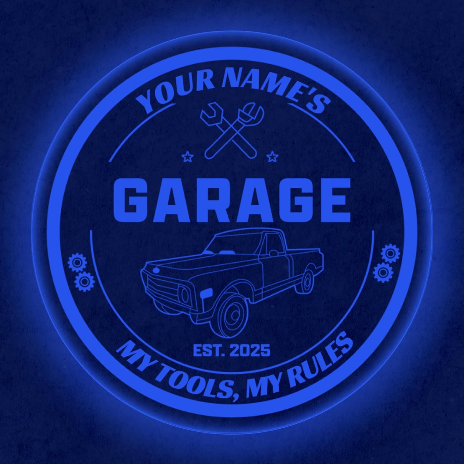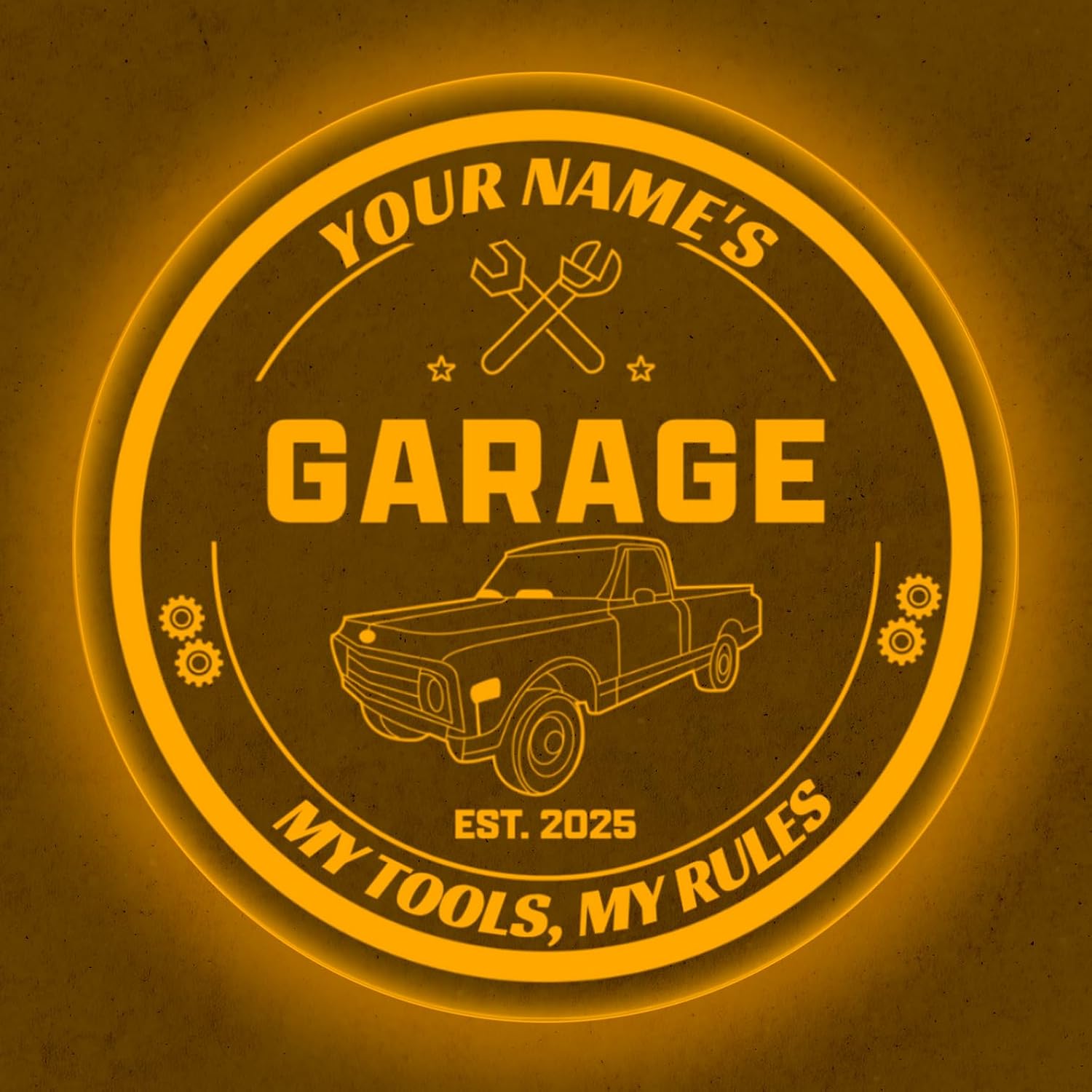 • Personalized Garage Truck Sign with LED Lights: Add your name, shop name, or fun phrase to this laser engraved acrylic sign with bright color changing LEDs for a bold garage or workshop vibe