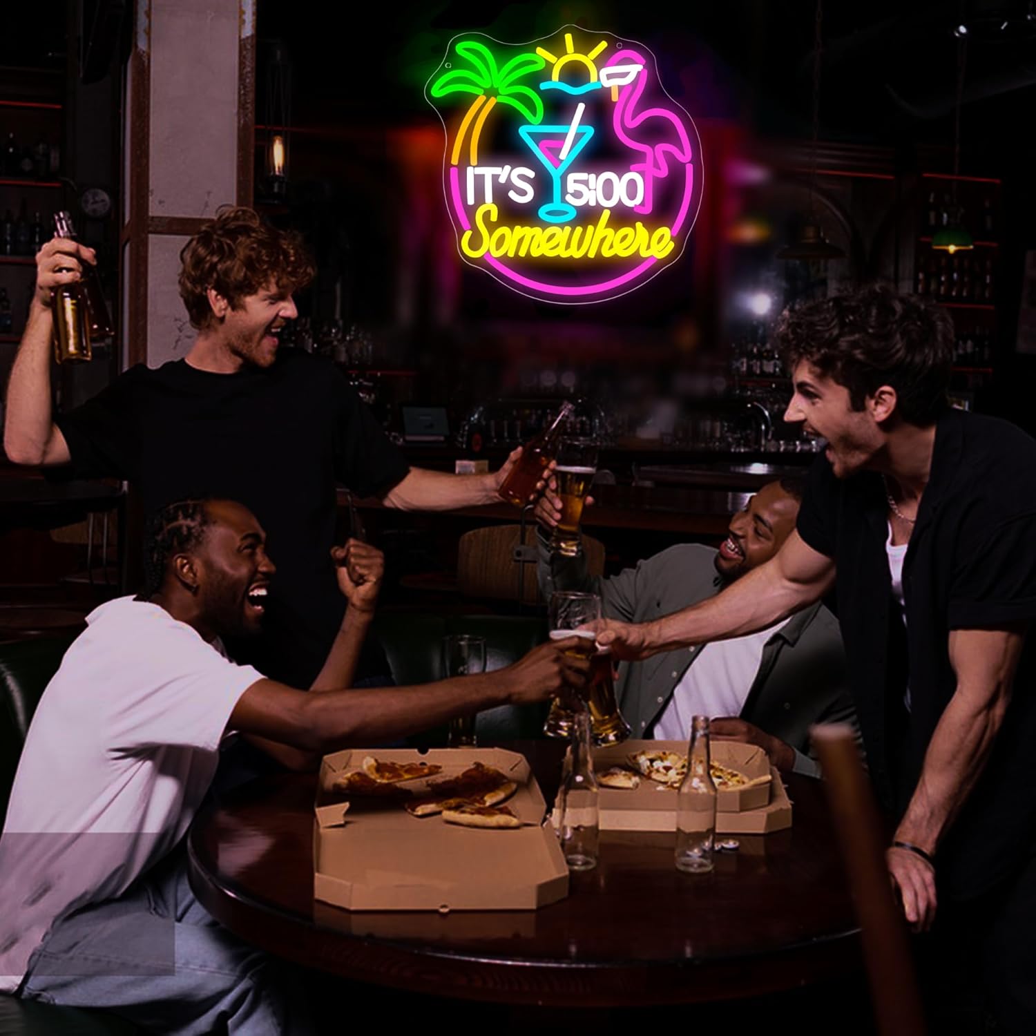 • Unique Design: The 5 o'clock somewhere neon sign blends the iconic its 5 o'clock somewhere slogan with a flamingo, palm tree, cocktail, and sun motif. Featuring lemon-yellow text and a roseo outline, it pops against many backdrop. Ideal for adding a tropical, laid - back vibe to bars, patios, or beach-themed spaces and perfect for those who crave vacation energy anytime