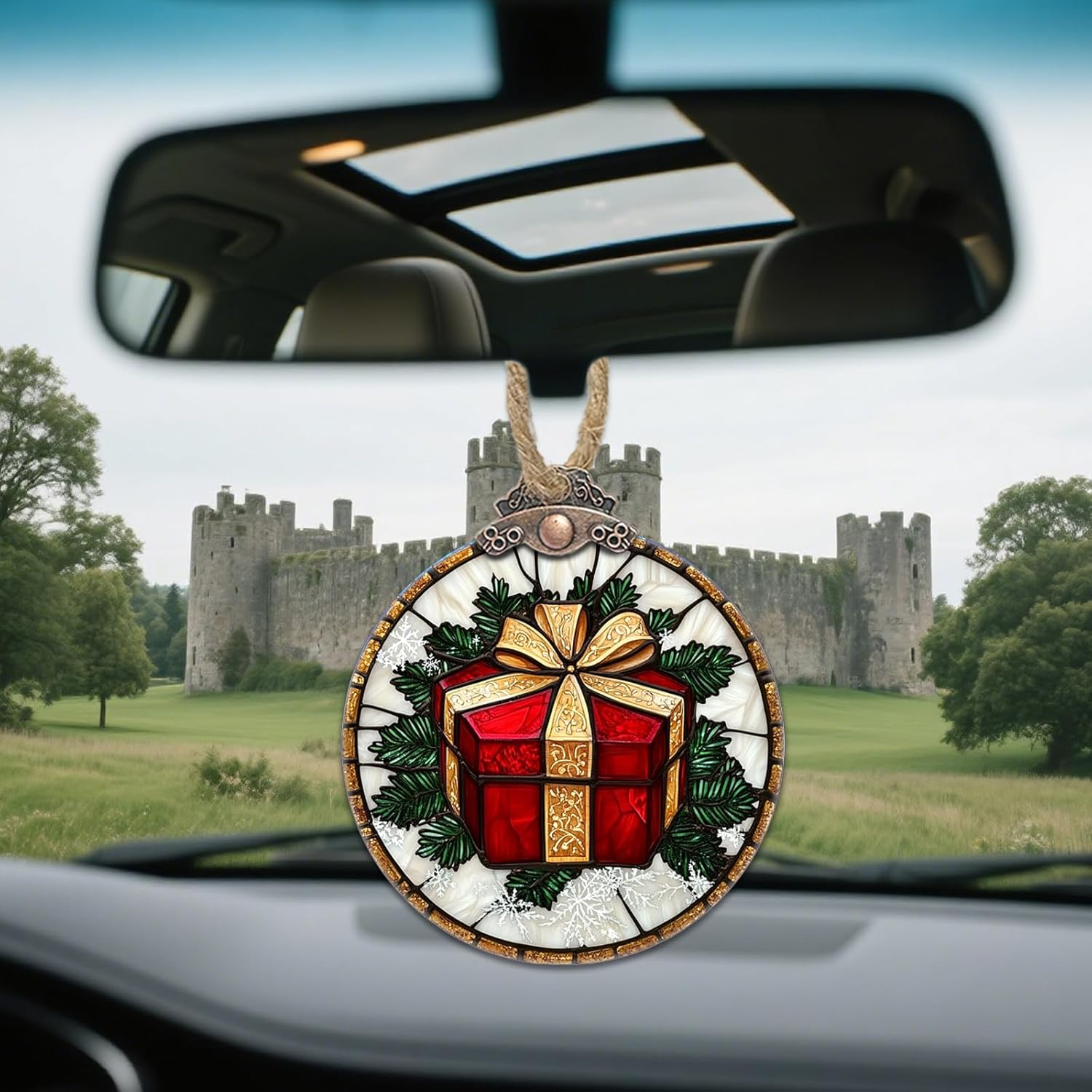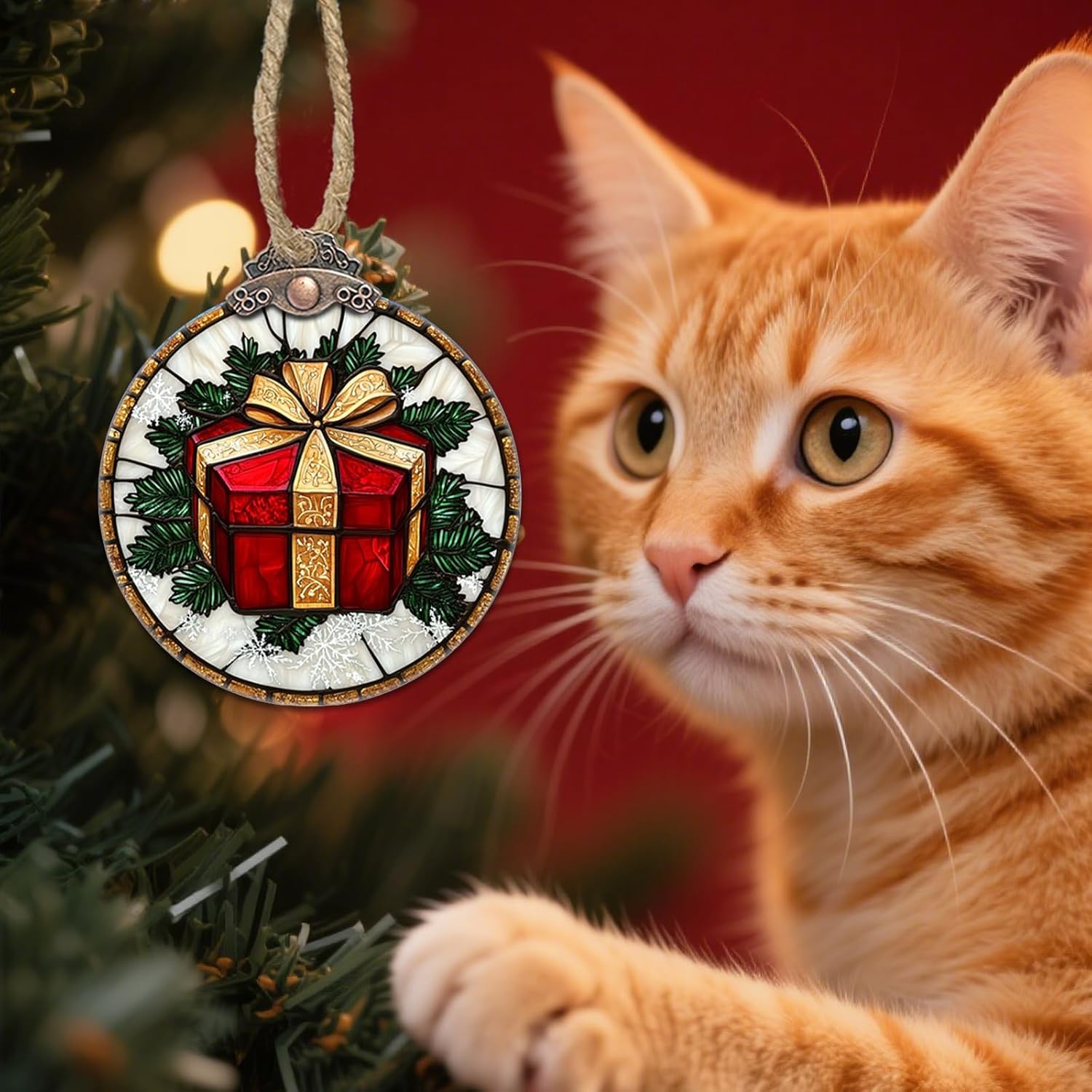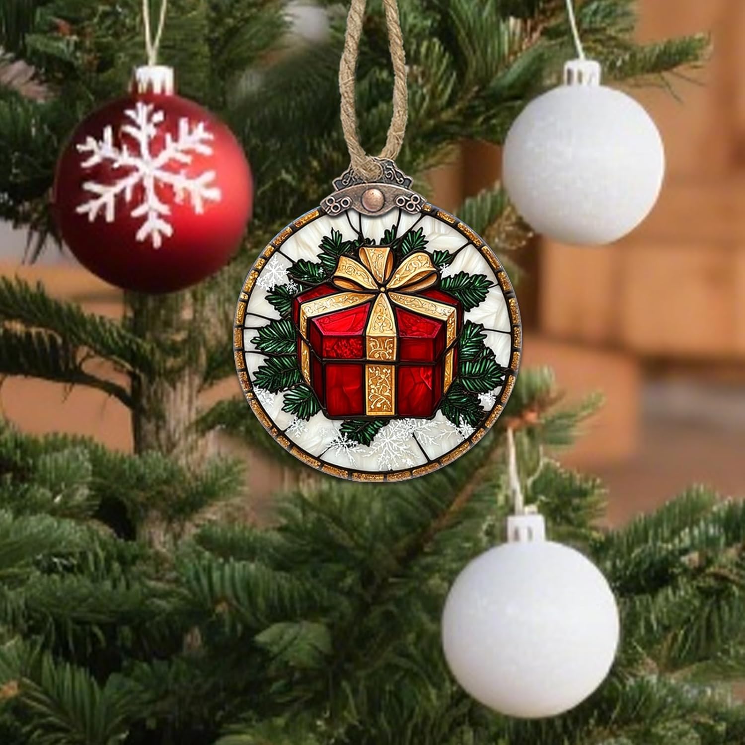 Stained Glass Christmas Decorations, Red Gift Gold Ribbon Suncatcher for Window Christmas Tree Hanging Ornaments Retro White Sun Catcher Xmas Decor Gifts for Women Men Mom Nana Friend