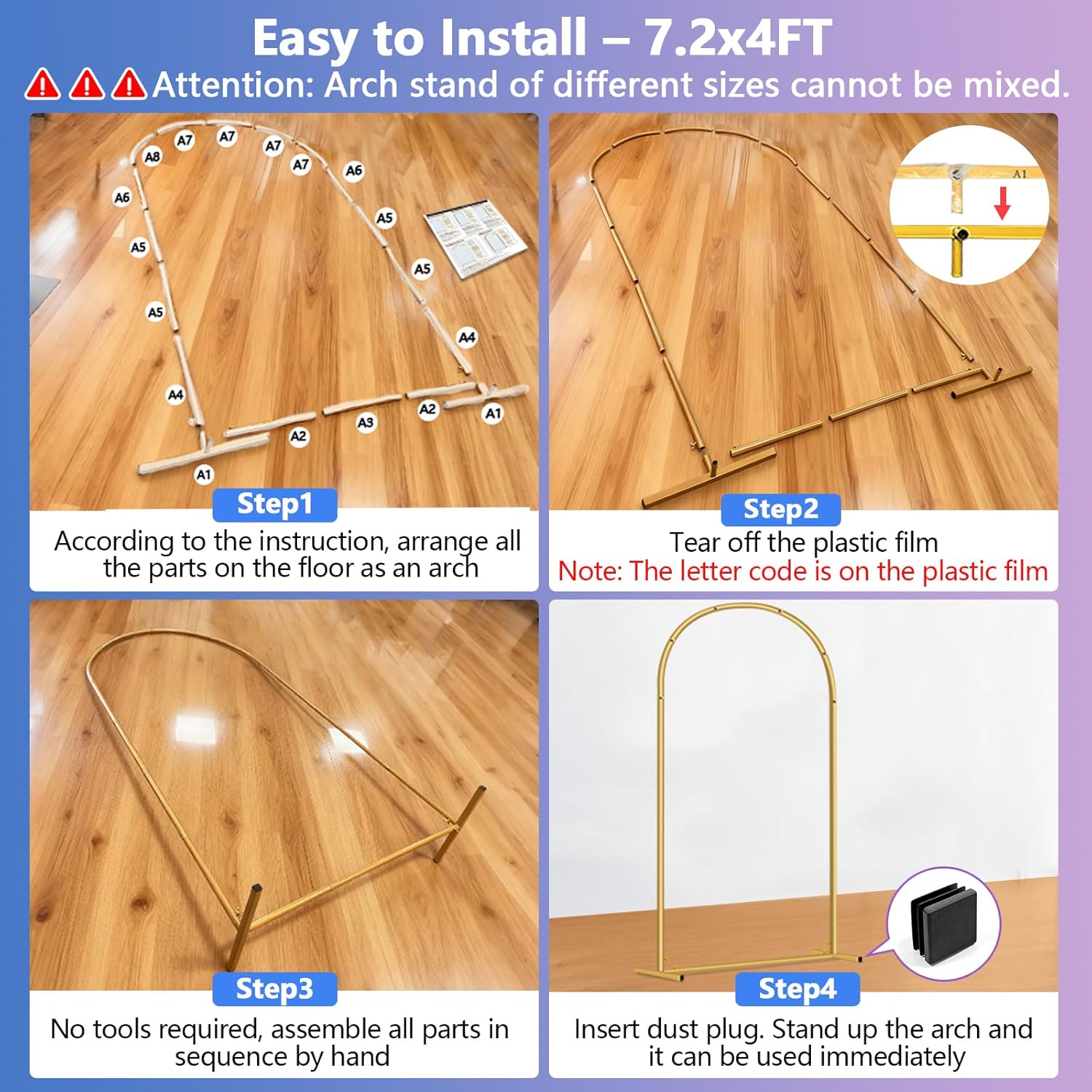 • Complete Ready to Use Kit: Includes all parts of arch backdrop stand set (size 7.2 ft/ 6.6 ft/ 6 ft), heavy-duty ground stakes (secures outdoor setups on grass or uneven terrain), 4 plastic dust-proof caps (blocks dirt/debris from tube ends), and an illustrated manual