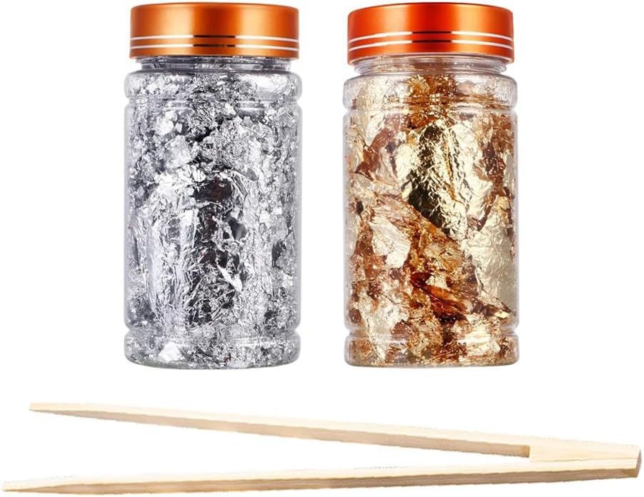 • with Wooden Tweezers: These gold flakes with tweezers come pre crushed into small, manageable pieces, our metallic foil flakes come with tweezers to help you easily pick up gold foil fragments, ensuring precise placement without any hassle; Each bottle contains 10g of flakes, with a total of 20g included in the package