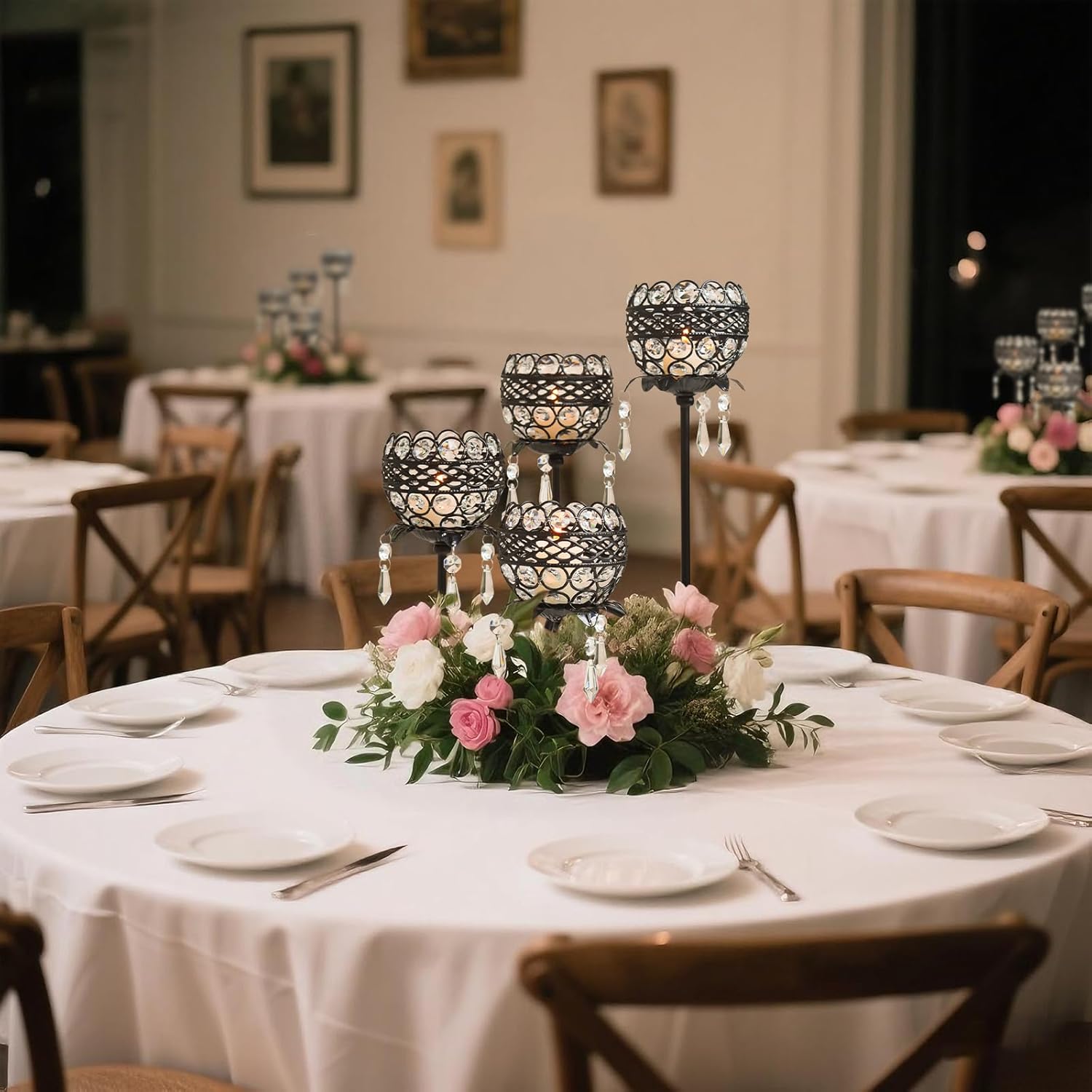 • Dazzling Crystal Bowls & Pendants:Each arm holds a 3.9-inch (10cm) wide crystal bowl with a 1.8-inch (4.5cm) inner tray, designed to securely fit standard tealights while shimmering glass pendants refract light into radiant patterns across your room.