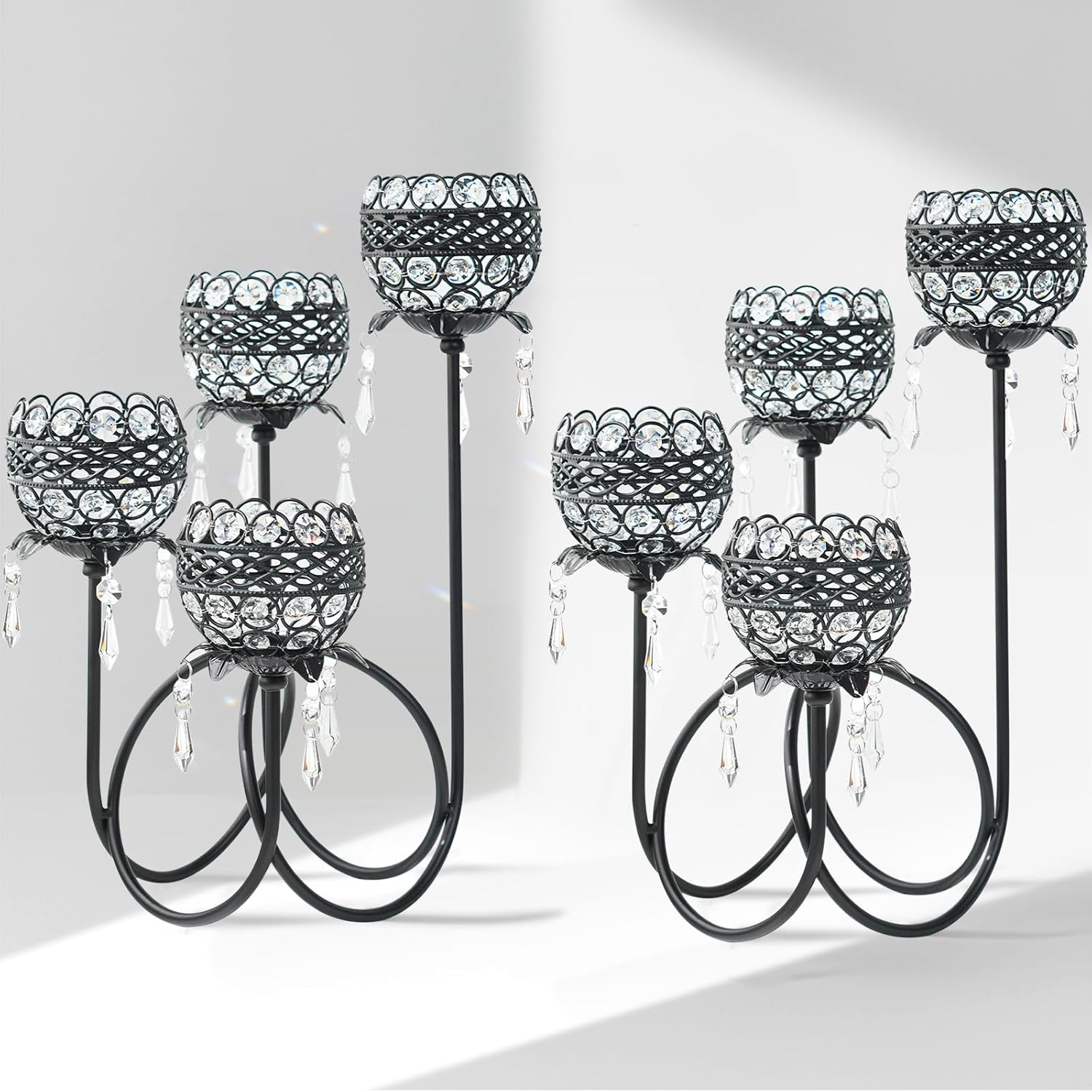 4 Arms Crystal Candelabra Tealight Holder - Tall 15.7 Inch Elegant Centerpiece with Crystal Pendant Bowls & Artistic Metal Stand for Wedding, Dining Table, Home Decor (2, Black)