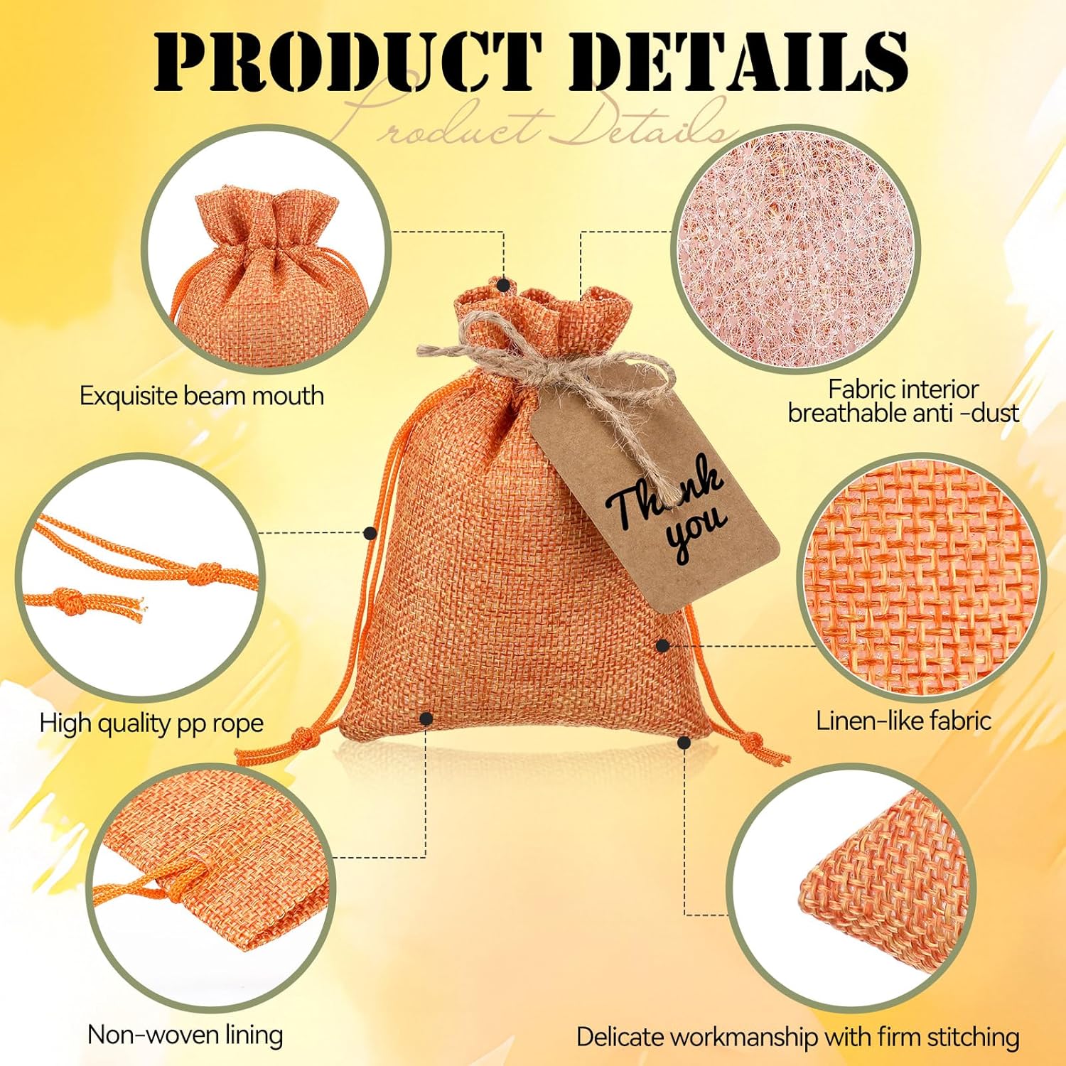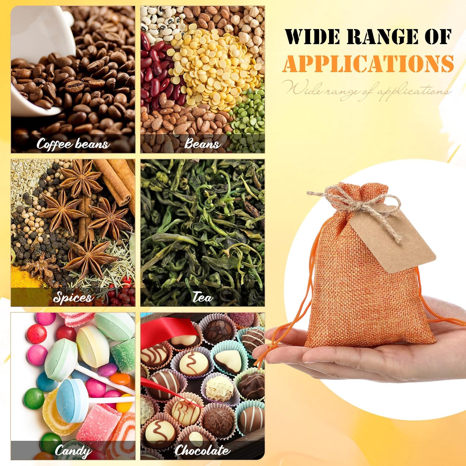 Woanger 100 Pcs Burlap Gift Bags with 100 Pcs Kraft Paper Gift Tags Drawstring Favor Bulk Burlap Sack Bags for DIY Wedding Party Craft(4 x 6 Inch,Natural Color, Dark Brown, Military Green, Orange)
