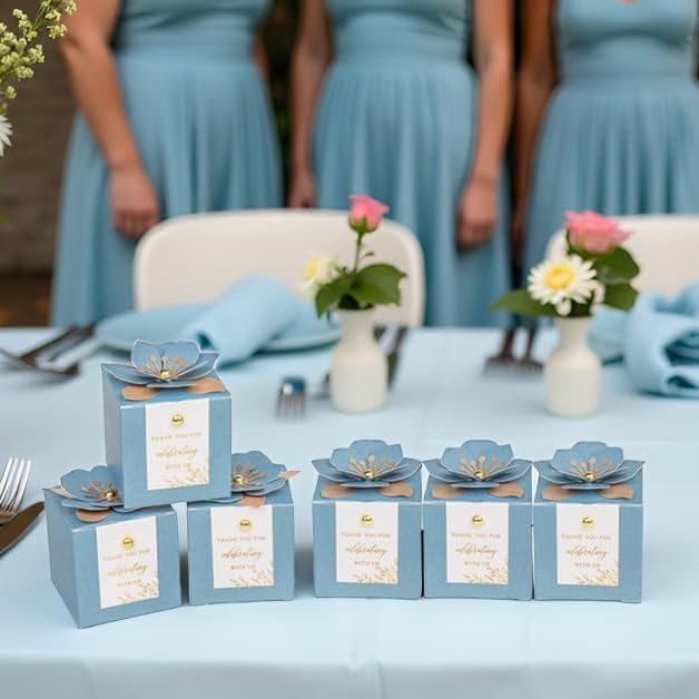 • 【3 in 1 favor boxes】: Include 20* unfold candy boxes, 20* dusty blue flower decor, 20* white thank you tags, 40* gold buttons. (The boxes need to be folded by yourself)
