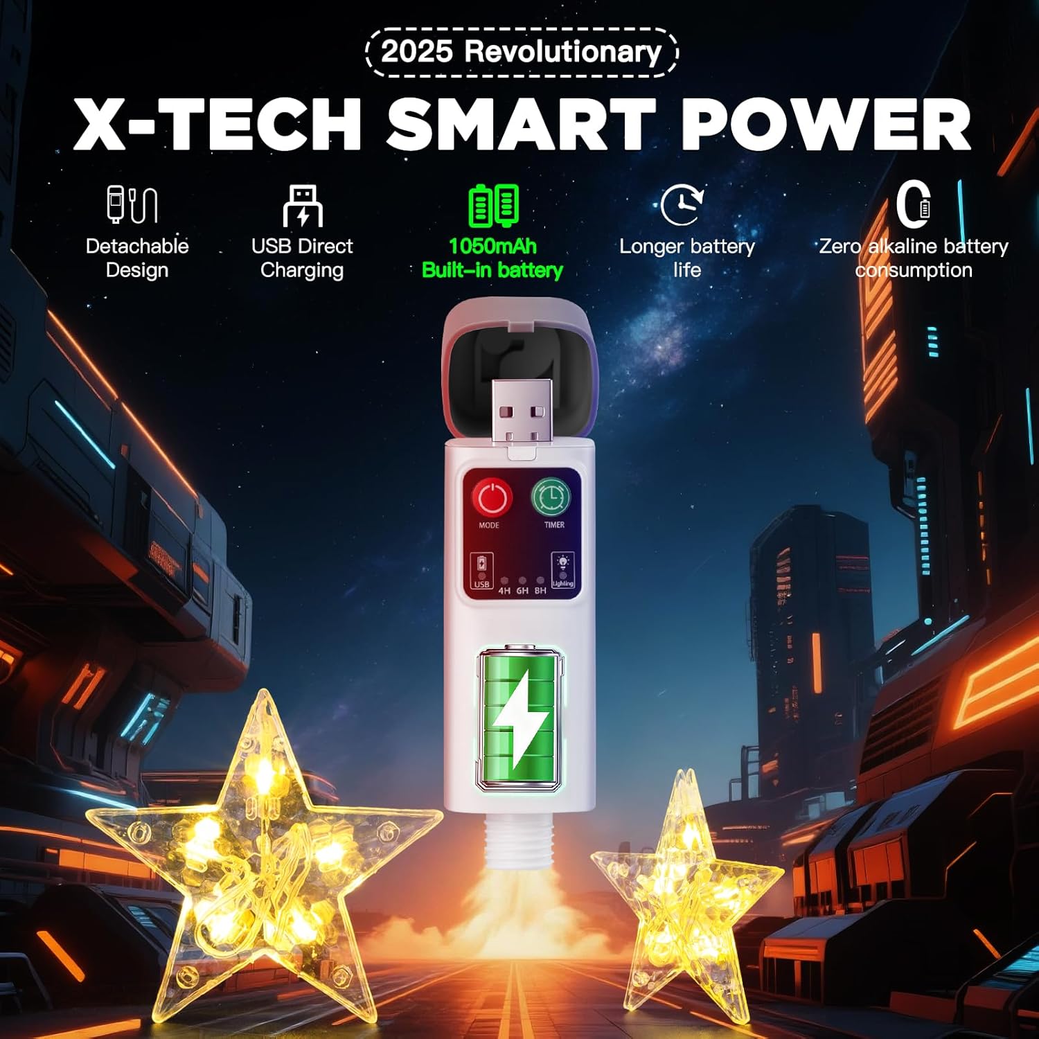 • 【Rechargeable & Detachable Power】Upgrade your Xmas decor with the innovative X-Tech Smart Power system! This built-in 1050mAh lithium battery supports direct USB charging and is fully detachable—making it more eco-friendly and efficient than traditional alkaline battery powered star window lights. Enjoy brighter Christmas star lights, longer runtime, and hassle-free recharging. This power solution delivers consistent luminosity while reducing waste. Say goodbye to dull lights and dead batteries!