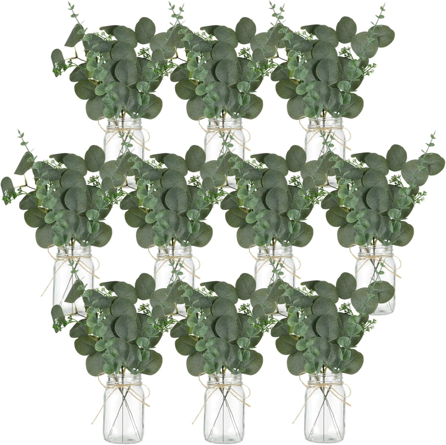10 Set Mason Jar Centerpieces for Tables Centerpiece with Eucalyptus Breath, Clear Glass Mason Jar Vases with Rope, Wedding Table Centerpieces Bridal Shower Engagement Reception Rustic Farmhouse Decor