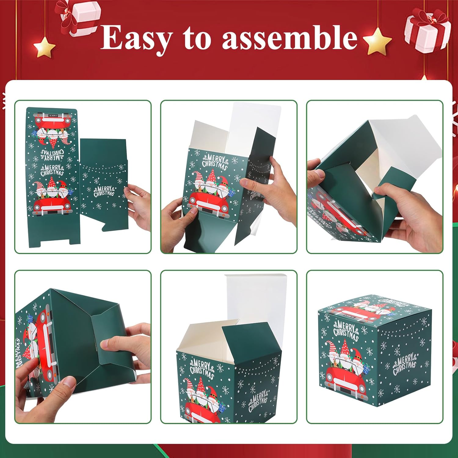 • Easy to Assemble :These christmas goodie boxes are come in flat and pre-folded,easy to be assembled, and are strong enough to hold small glass jars or cups. The neat box design makes them the ideal solution for awkwardly shaped gift items