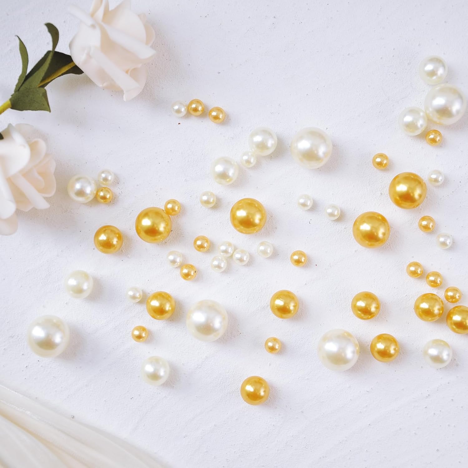 520Pcs Gold&Cream Beads for Centerpieces Decor, Artifical Pearls Vase Filler, Large Beads for Makeup Brush, No Hole Round Pearl Beads for Wedding Birthday Christmas Party Home Decor(18mm 14mm 6mm)