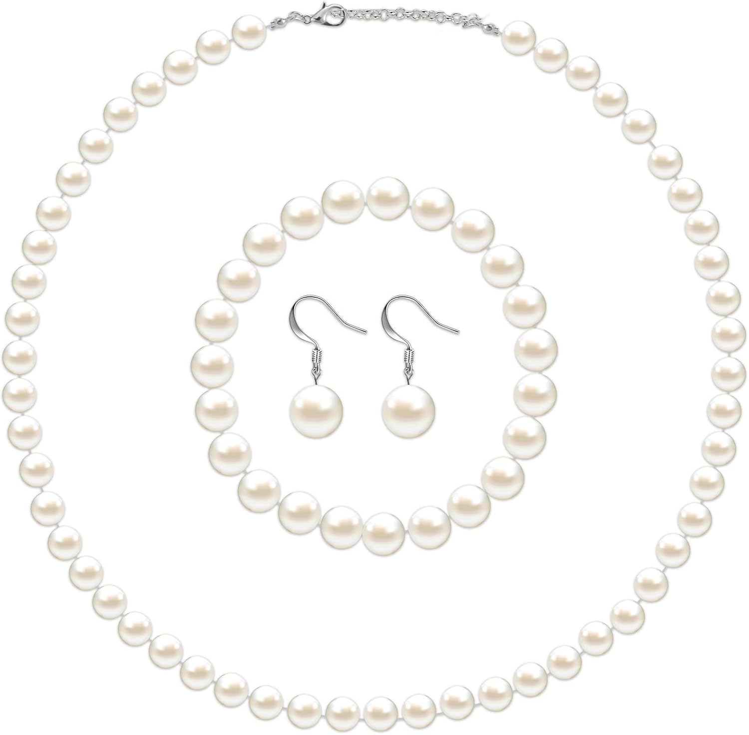 • Quality and Material: the pearls are ABS highlight pearls, each pearl is 8 mm in diameter, artificial imitation, not real pearl, the silver clasp of the pearl necklace and the silver needle of the earring are silver, can be worn for a long time, and won't burden your ears, easy to put on and take off