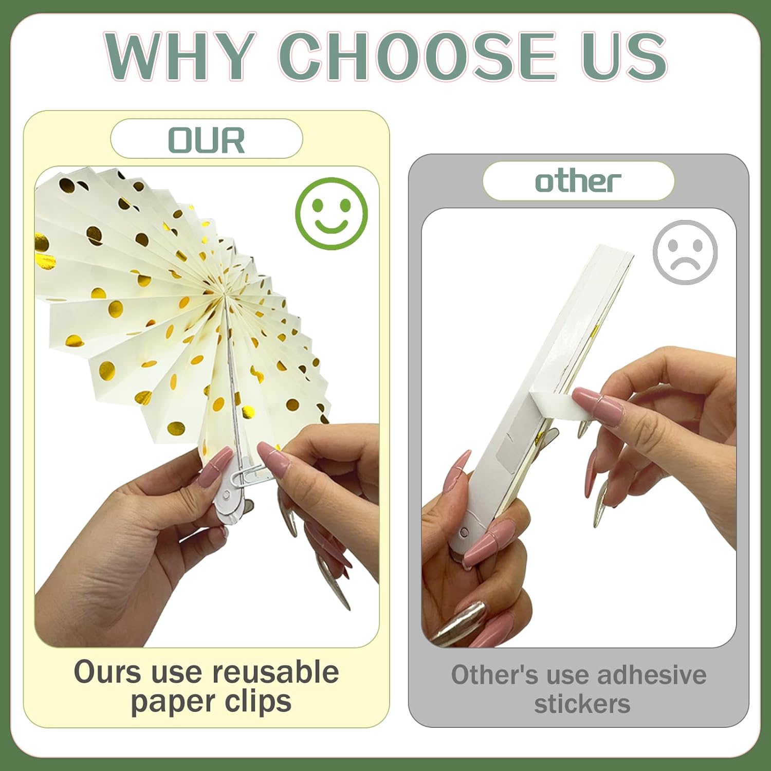 • 【Material】: Our sage green and peach paper lanterns are made of quality thin paper and wire bracket. They are lightweight and biodegradable, and effortless to hang and store. More environmentally friendly than traditional balloon decorations. Meanwhile, compared to other paper fans party decorations that use adhesive stickers, our hanging paper fans all use reusable paper clips.
