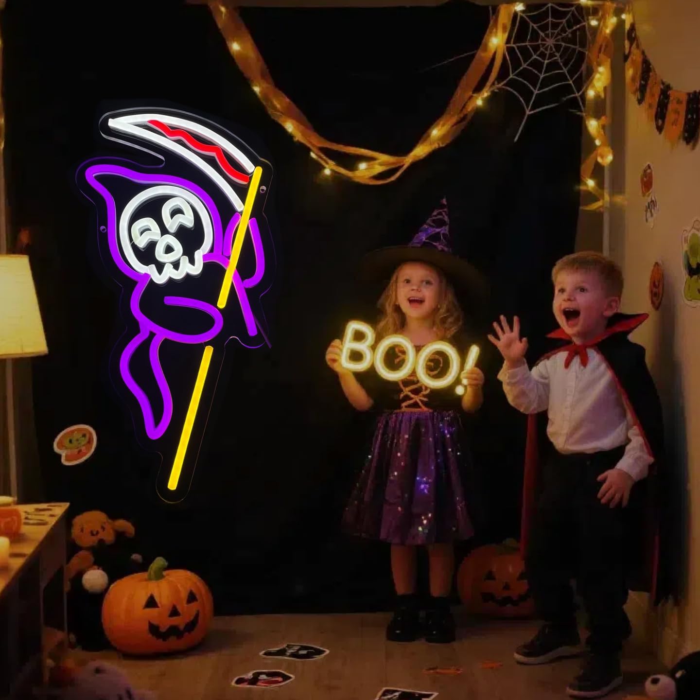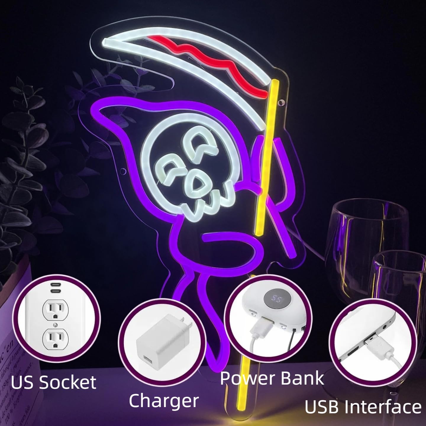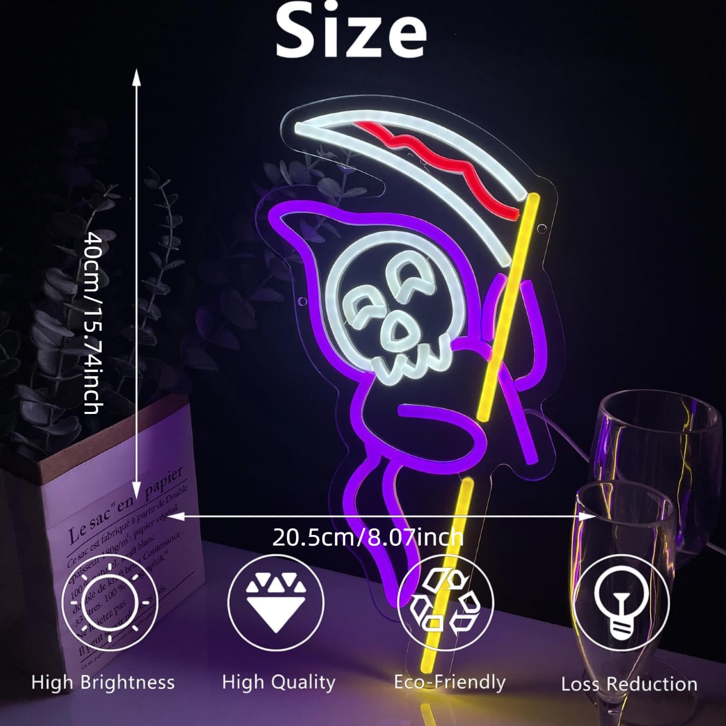 • HALLOWEEN Grim Reaper NEON SIGNS: Halloween Grim Reaper neon sign is a beautiful bedroom wall decoration with a unique Halloween theme design and scary colors, creating a Halloween spooky effect and festive atmosphere.