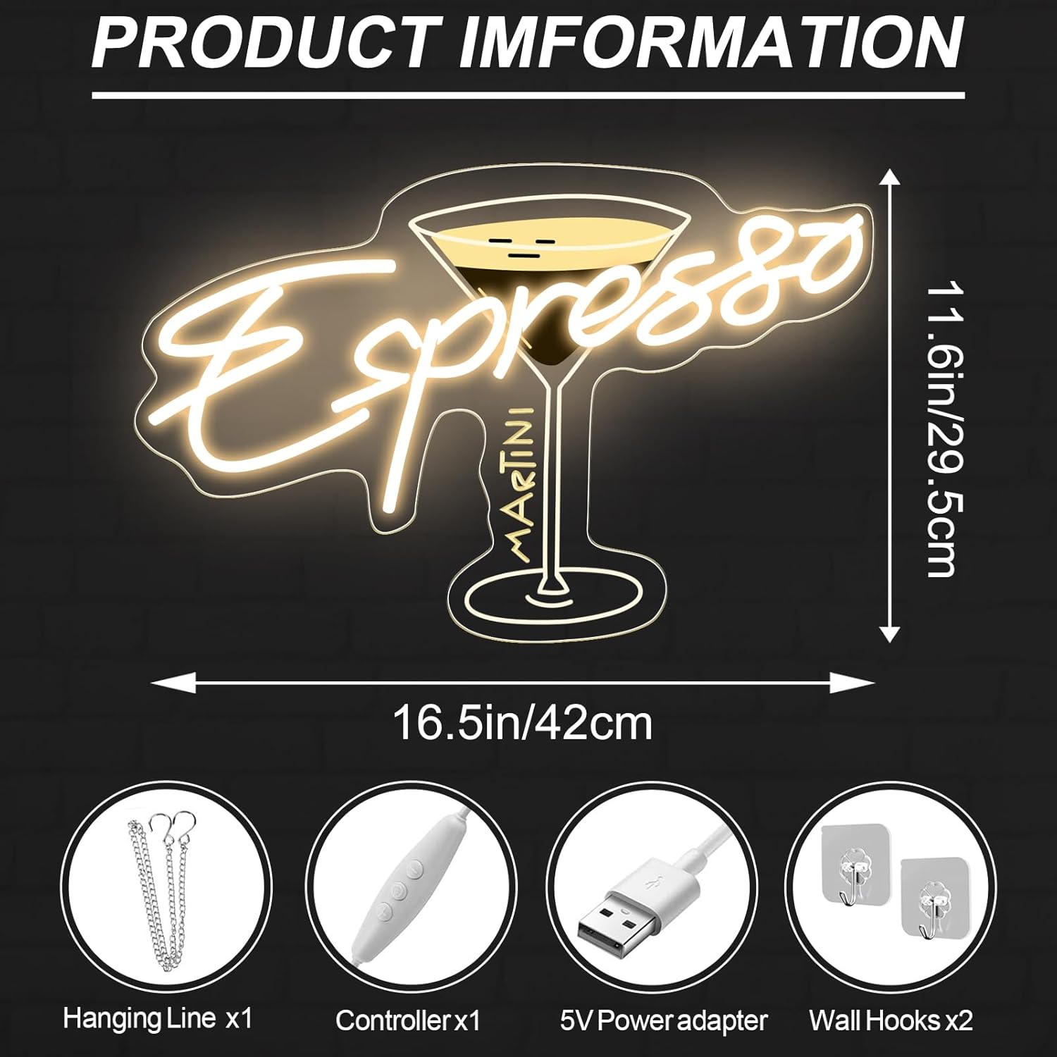 • What you get: Espresso martini neon sign x1, hanging chain x1, wall hooks x2. Every LED light undergoes rigorous quality checks before it ships. If you have any problem with our neon light, please feel free to contact us. We will try our best to serve you