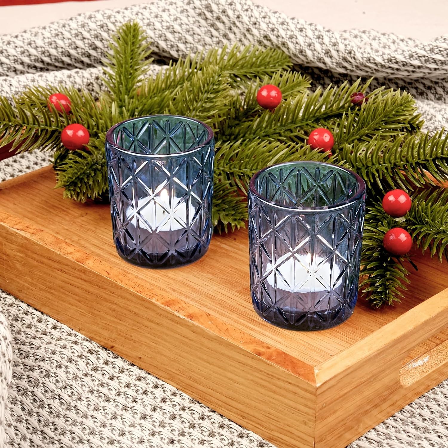 • 🕯 24 Piece Candle Holder Set: Package includes 24 blue glass votive candle holders, plenty of them for your family. The height of each tea light candle holder is 2.5 inches/6.5 cm and the diameter of the bottom is 2 inches/5 cm.