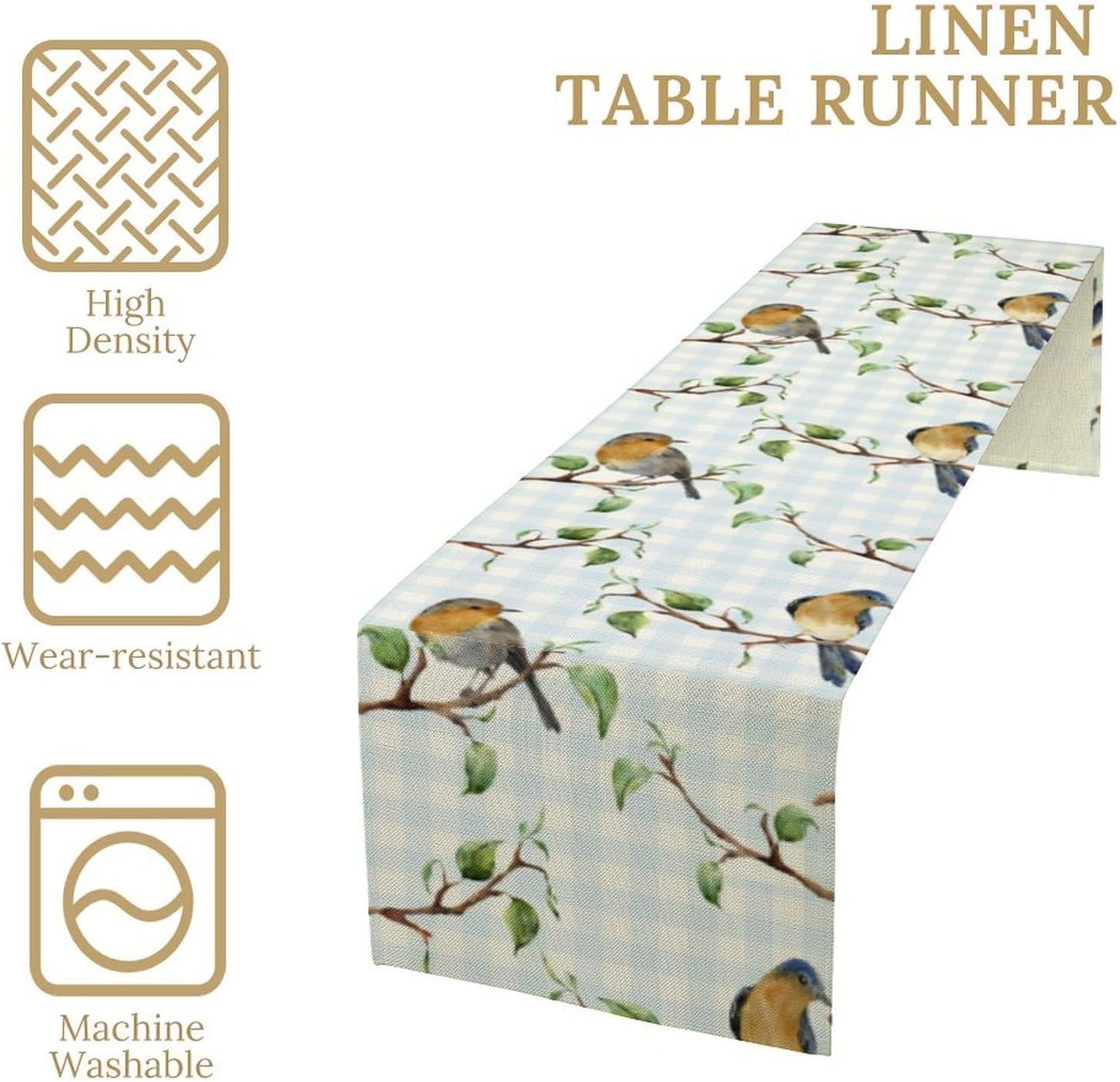 Bird Table Runner,Spring Birds Tree Blue Plaid Print Table Runner for Kitchen Dining Table Decoration Home Party Decor 13x90 Inch