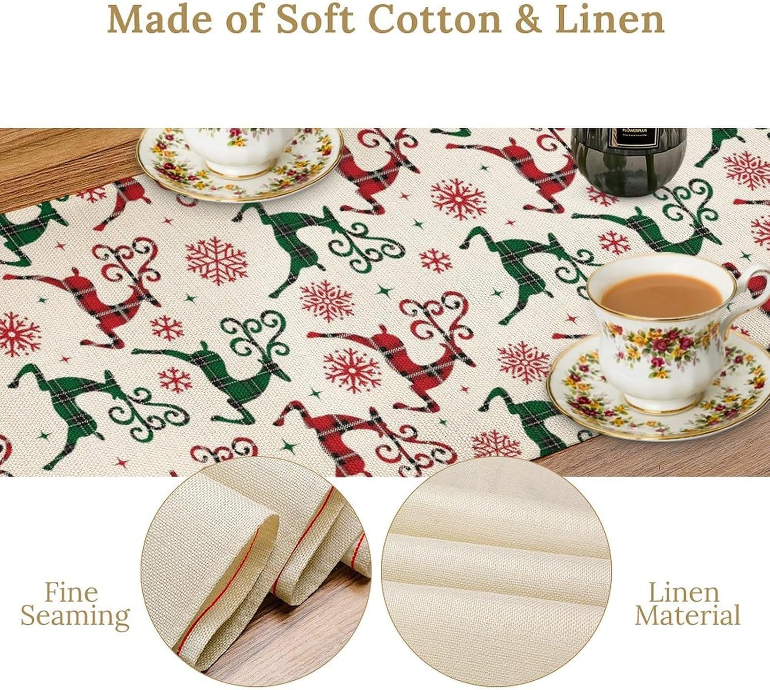 Christmas Table Runner,Christmas Plaid Deer Print Farmhouse Table Cloth Kitchen Dining Table Decoration for Home Party Decor 13x60 Inch
