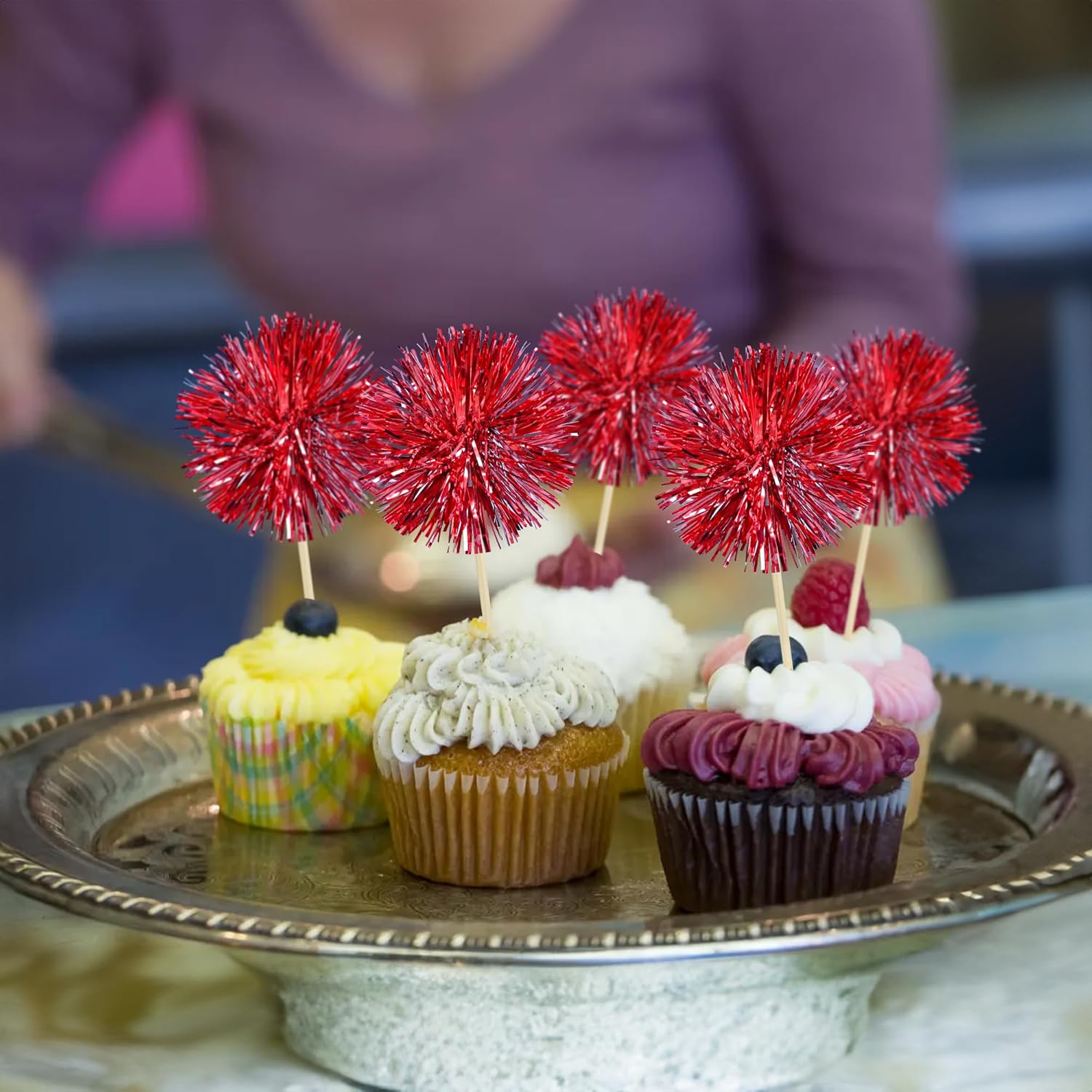 Gyufise 30Pcs Foil Firework Cupcake Toppers Sparkle Tinsel Cake Toppers Tinsel Drink Cake Decoration Cocktail Picks for Birthday Wedding Graduation Party Supplies Dark Red