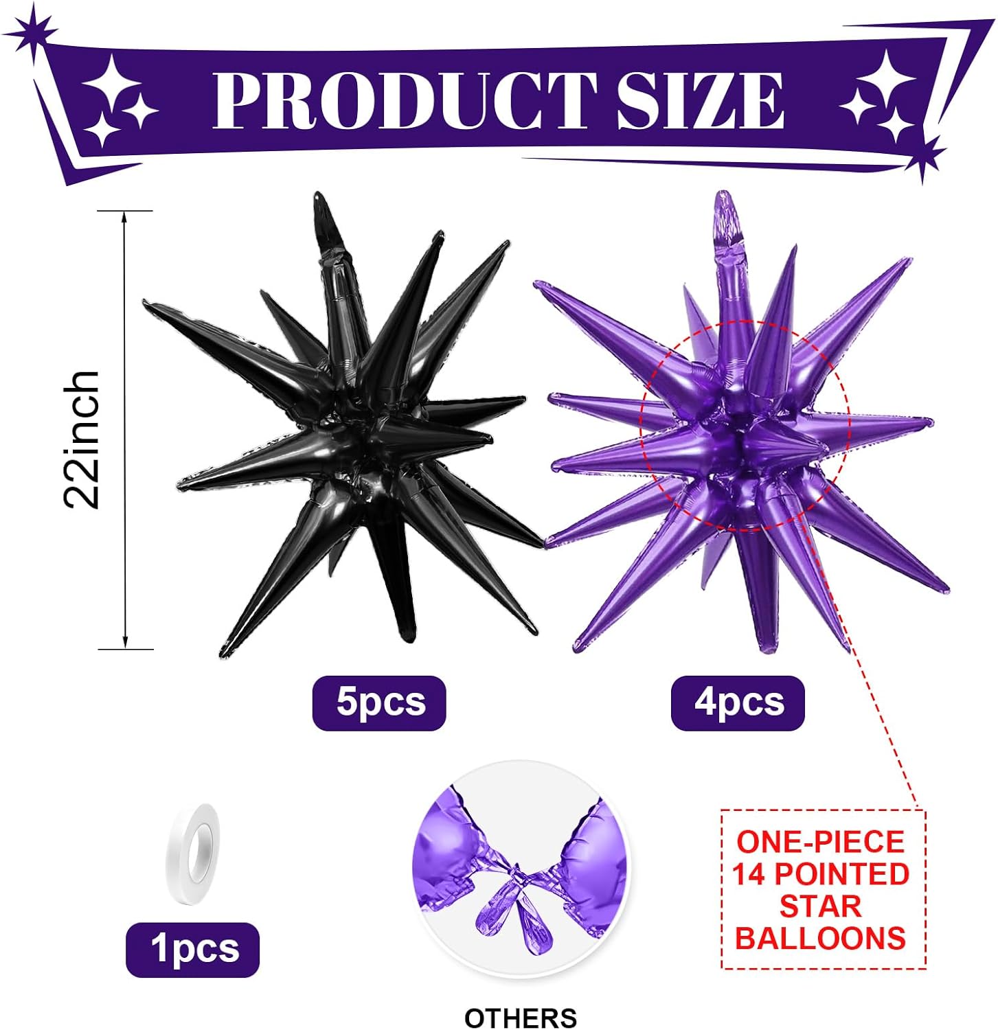 Black Purple Star Balloons,9Pcs 22Inch Black Purple Explosion Spike Cone Helium Polyester Film Star Foil Balloons for Birthday Halloween Anniversary Baby Shower Party Decorations