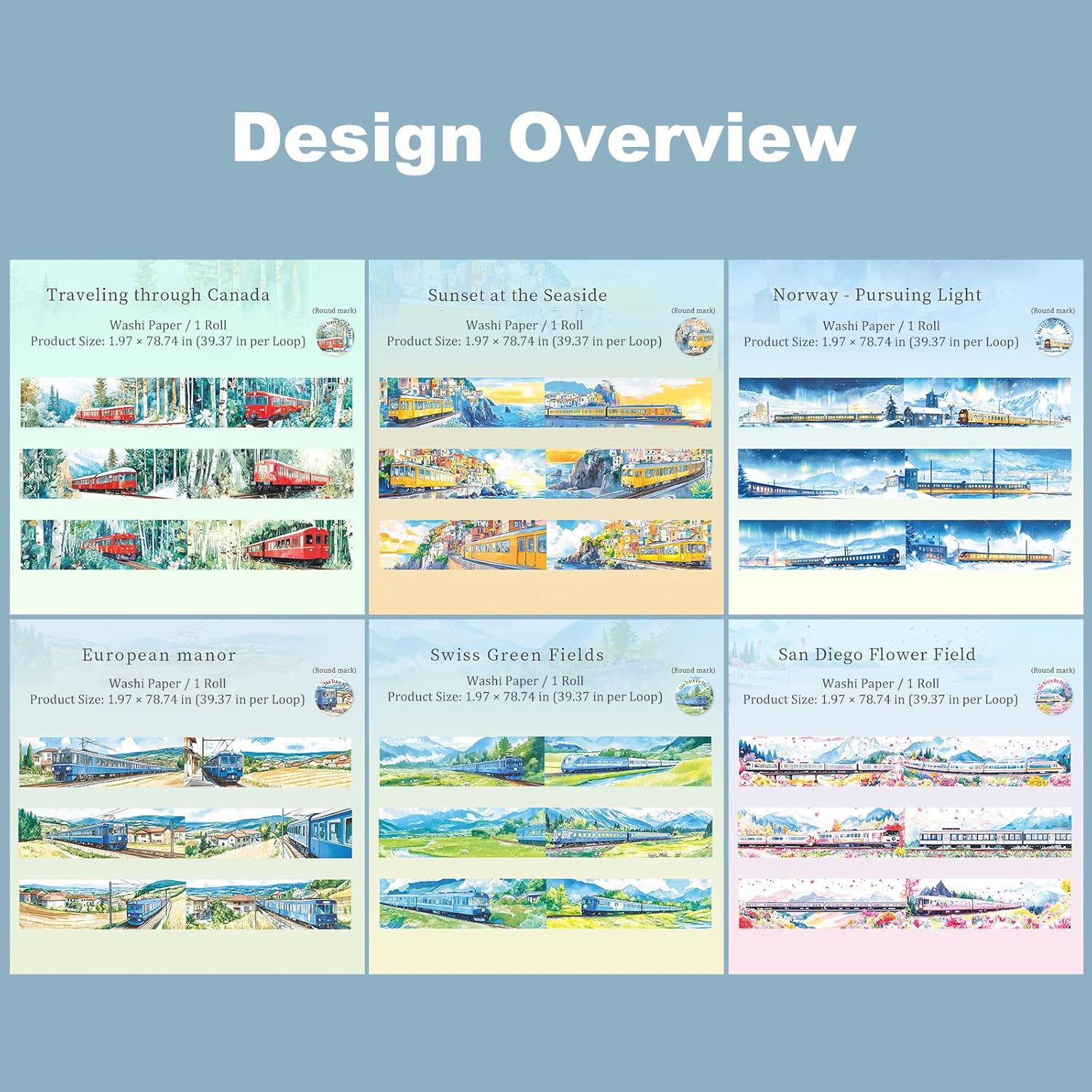 • Train Scenery Designs: 6 unique rolls feature colorful train and landscape illustrations adding a storytelling touch to travel journals scrapbooks and memory albums for creative projects with vivid seasonal charm