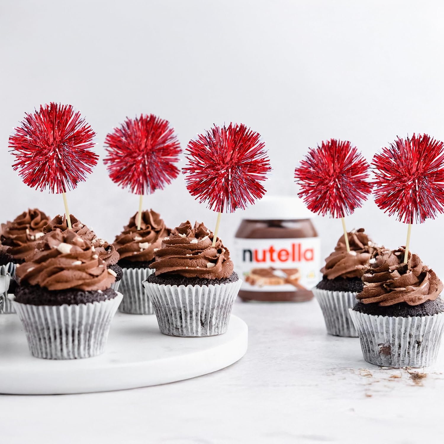 Ephlyn 30Pcs Foil Firework Cupcake Toppers Sparkle Tinsel Cupcake Picks Happy Birthday Cake Toppers Drink Stirrers Cocktail Food Fruit Toothpicks for Baby Shower Birthday Party Supplies Red