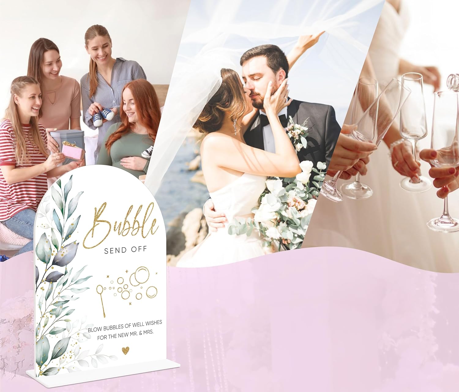 Acrylic Wedding Signs, Greenery Theme Bubbles Send Off Sign, Wedding Reception Signage, Bridal Shower Table Decor with Stand, Engagement, Anniversary, Newlywed Events and Parties Supplies, 14