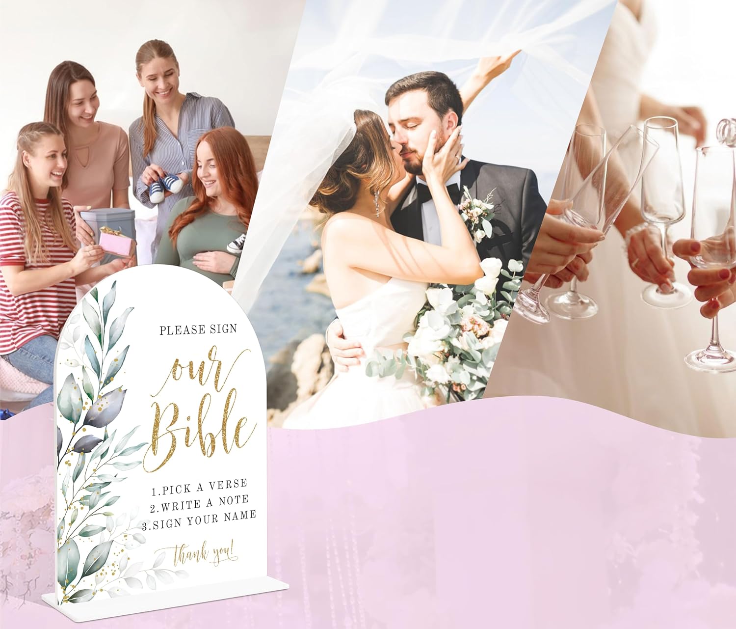 Acrylic Wedding Signs, Greenery Theme Please Sign Our Bible, Wedding Reception Signage, Bridal Shower Table Decor with Stand, Engagement, Anniversary, Newlywed Events and Parties Supplies, 11