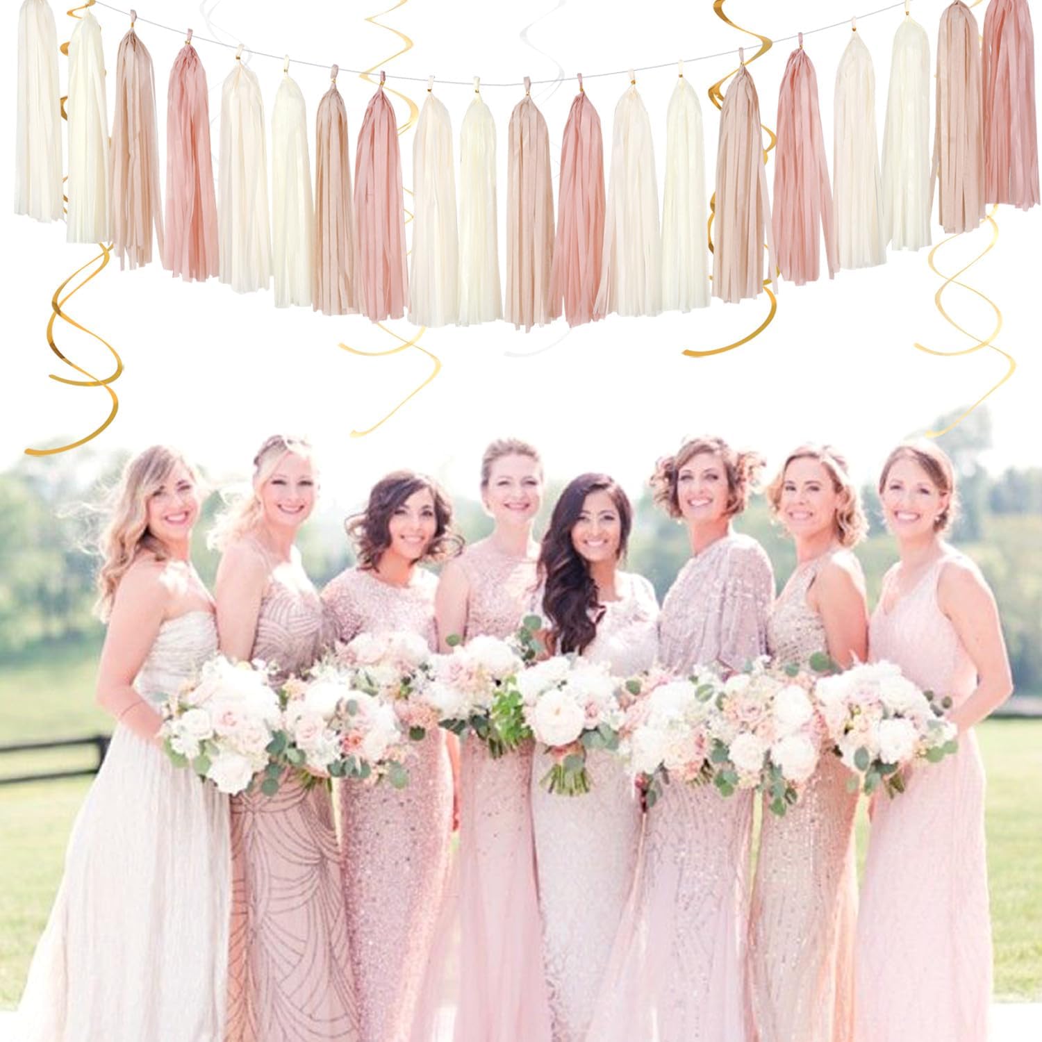 • 【Garland includes】20tassels in champagen gold beige ivory blush pink color. Each tassel is about 14" long after assembled. And each garland comes with a 10ft long free String for hanging these tassels.