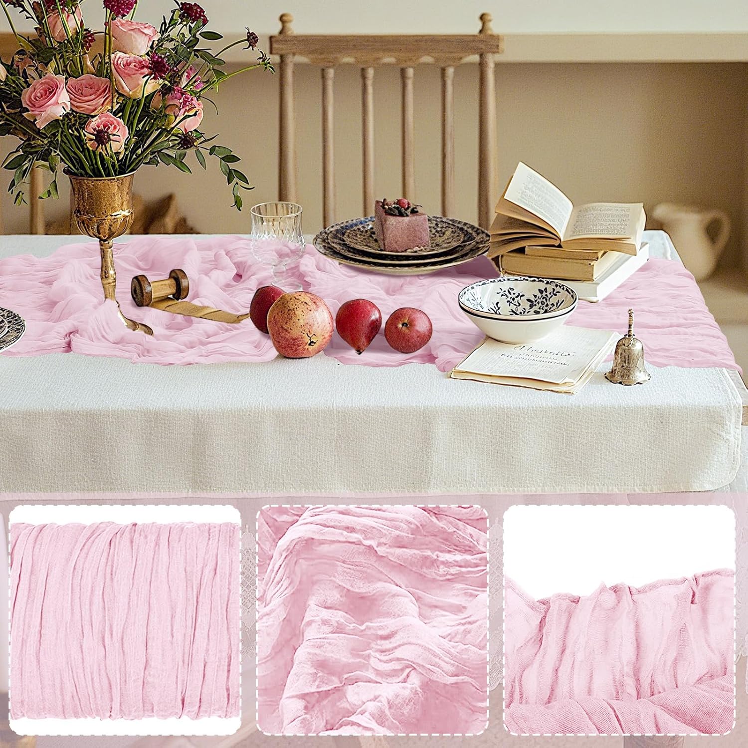 • 【Soft Material】: Made of high quality polyester, soft to touch, comfortable and durable. Wrinkled design cheese cloth farbic, delicate edges and stitches, adopts seamless technique makes this sheer table runner more graceful than traditional fabrics. Our cheesecloth wedding table runners are durable, the colour stays for a long time, does not fade and can be reused.